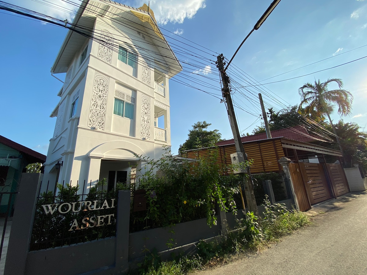 Usando o estilo colonial que são 4 tipos de quarto diferentes. O exterior é um edifício branco com design de estêncil do norte da Tailândia feito pelo proprietário. Localizado na cidade antiga, fácil de explorar ao redor da cidade antiga, perto do aeroporto e desfrutar de conexão de internet de alta velocidade. Venha ficar conosco “Wourlai Asset”