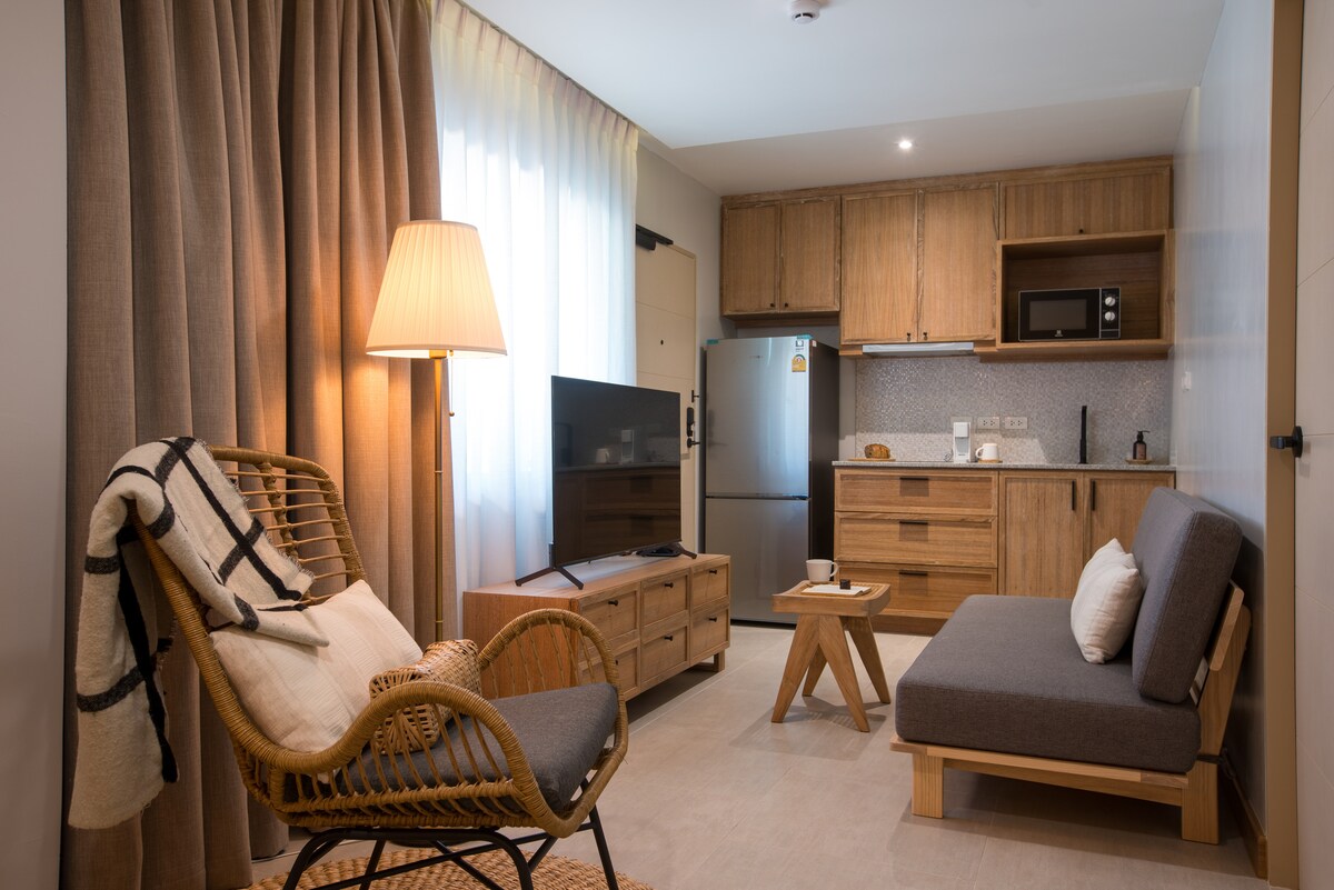 Apartamento mobiliado de luxo em madeira artesanal tailandesa tradicional Lanna. 36 m² oferecem um quarto, uma sala de estar, cozinha totalmente equipada e um banheiro privativo. Inclui: limpeza semanal de quarto/roupa de cama semanal/Wi-Fi de alta velocidade/TV/gás/água/eletricidade totalmente incluídos. Lavanderia pessoal disponível. Paredes de comunidade fechadas, guarda 24 horas por dia, 7 dias por semana, bares, CFTV, ideal para mães solteiras Um contrato de locação será necessário na chegada. Velocidade de upload/download de Wi-Fi de 50 Mbps com backup de eletricidade ideal para trabalho online.