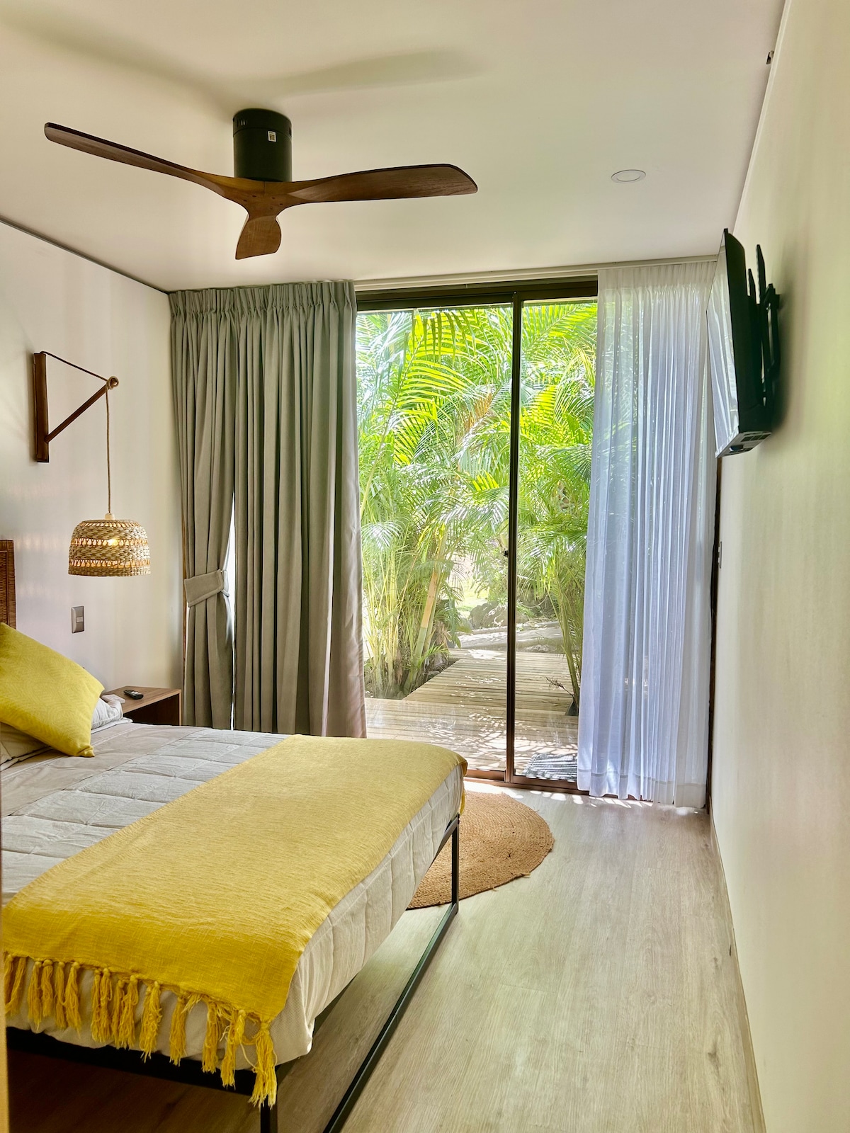 Bela vista para o jardim de palmeiras com terraço.