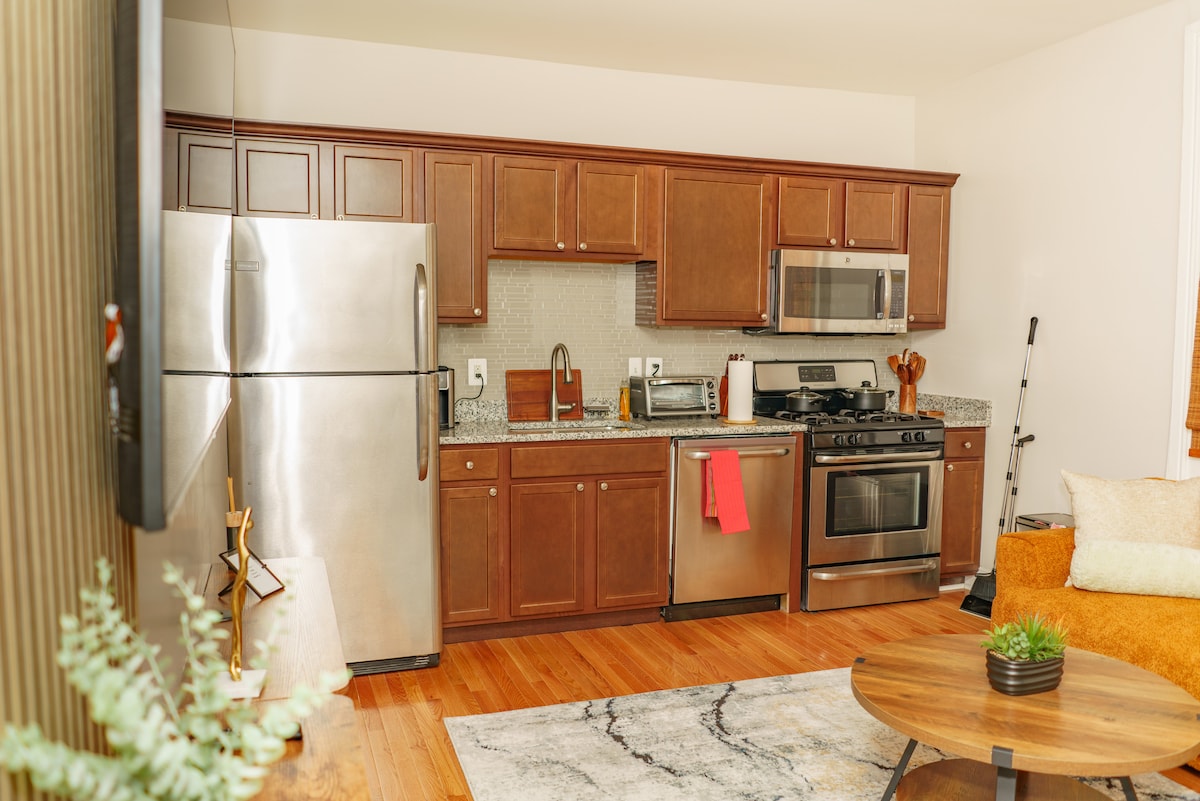 Bem-vindo (a) ao nosso apartamento sereno e elegante no bairro histórico de Baltimore! Este espaço chique e moderno combina conforto e elegância, perfeito para uma estadia relaxante. Desfrute de uma cozinha totalmente equipada, de uma área de estar acolhedora e de uma lareira encantadora. O espaçoso quarto dispõe de um espaço de trabalho e o apartamento inclui comodidades de lavandaria e uma casa de banho moderna. Localizado perto do Eutaw Place Median Park, Druid Hill Park, restaurantes e cafés com as melhores avaliações. Descubra a cultura vibrante do bairro. Reserve já!