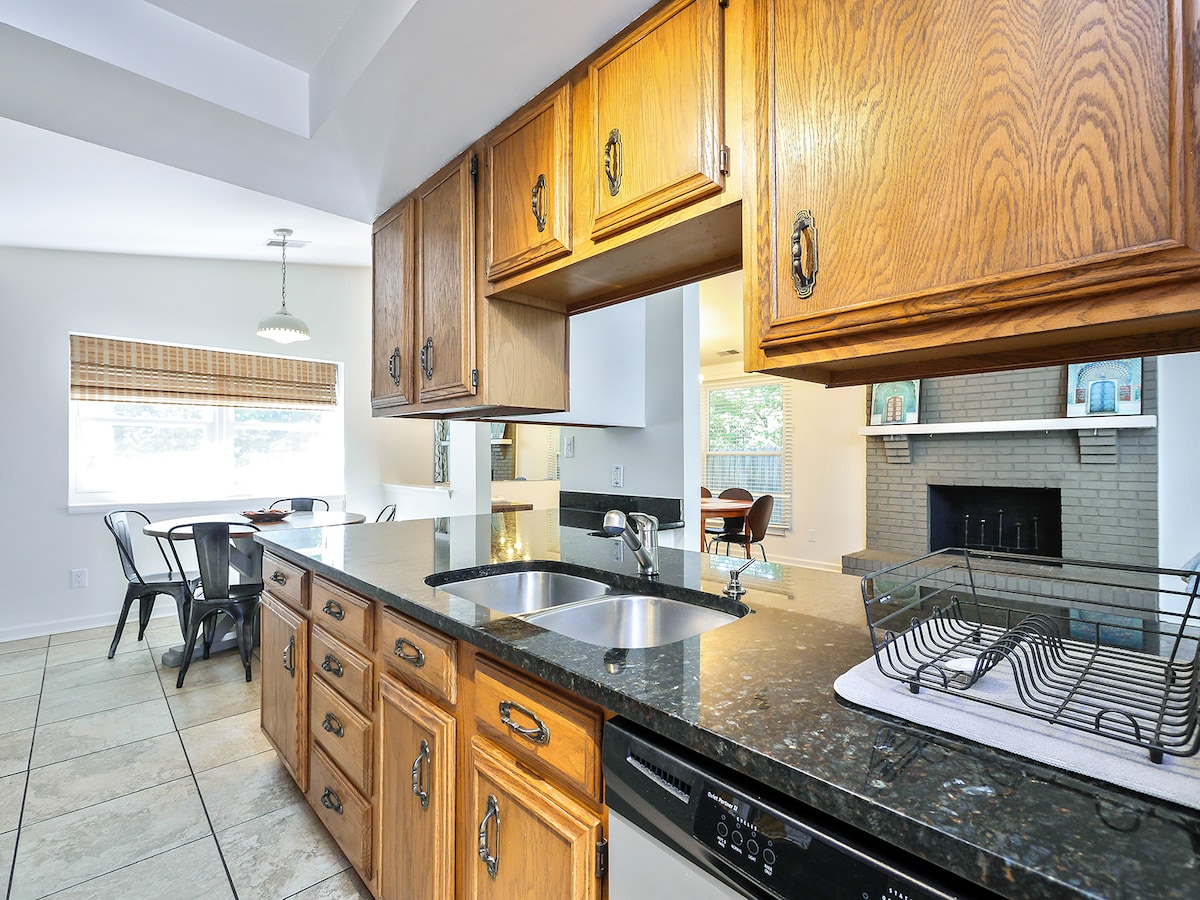Estique-se e relaxe em nossa espaçosa casa renovada de 3400 pés quadrados. Dê um mergulho na piscina da comunidade, jogue corn hole no enorme quintal, vença o título invicto da vovó no Connect4 ou relaxe junto à lareira com um bom livro. Recarregue as energias no bar de café ou caminhe pelo nosso bairro tranquilo e amigável. Prepare uma refeição gourmet em nossa cozinha totalmente abastecida ou faça uma curta viagem de carro até uma infinidade de restaurantes. Termine o dia com um banho de espuma relaxante e uma noite tranquila em nossos colchões de espuma de memória.