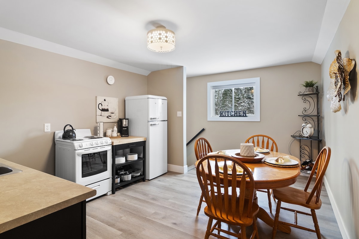 Totalmente equipado para todas as estações, 2 quartos com 1 cama de luxo em cada, chuveiro walk-in, eletrodomésticos de cozinha de tamanho completo. Banheira de hidromassagem privativa fechada, sauna a vapor, chuveiro frio ao ar livre/reabertura na primavera de 2026, varanda com tela. Fogueira com lenha comp. Oferecemos todas as comodidades de que precisa para ter uma estadia incrível. Utilização sazonal de churrasqueira e sapatos de neve. Caminhadas, ciclismo ATV/trilhos de trenó, cascatas, cervejarias artesanais, lojas, restaurantes e Crabbe Mountain nas proximidades. Pôr do sol deslumbrante do magnífico rio Saint John.