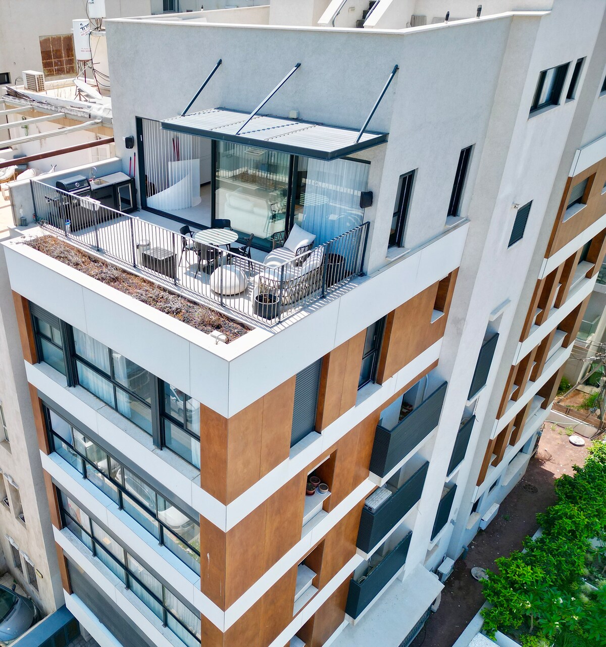 Apartamento espaçoso no centro da cidade de Tel Aviv com vista urbana até ao mar. Dois quartos principais com casas de banho privadas e chuveiro. Quarto individual adicional. Varanda enorme com sofás, mesa de jantar, churrasqueira. Cozinha grande, sala de estar grande. Casa de banho de hóspedes. Edifício novo, elevador, lugar de estacionamento privado. 7 minutos a pé da HaBima ou da estação ferroviária de Shalom. 1 minuto a pé da estação de metro ligeiro. Mesmo ao lado do Parque Sarona.