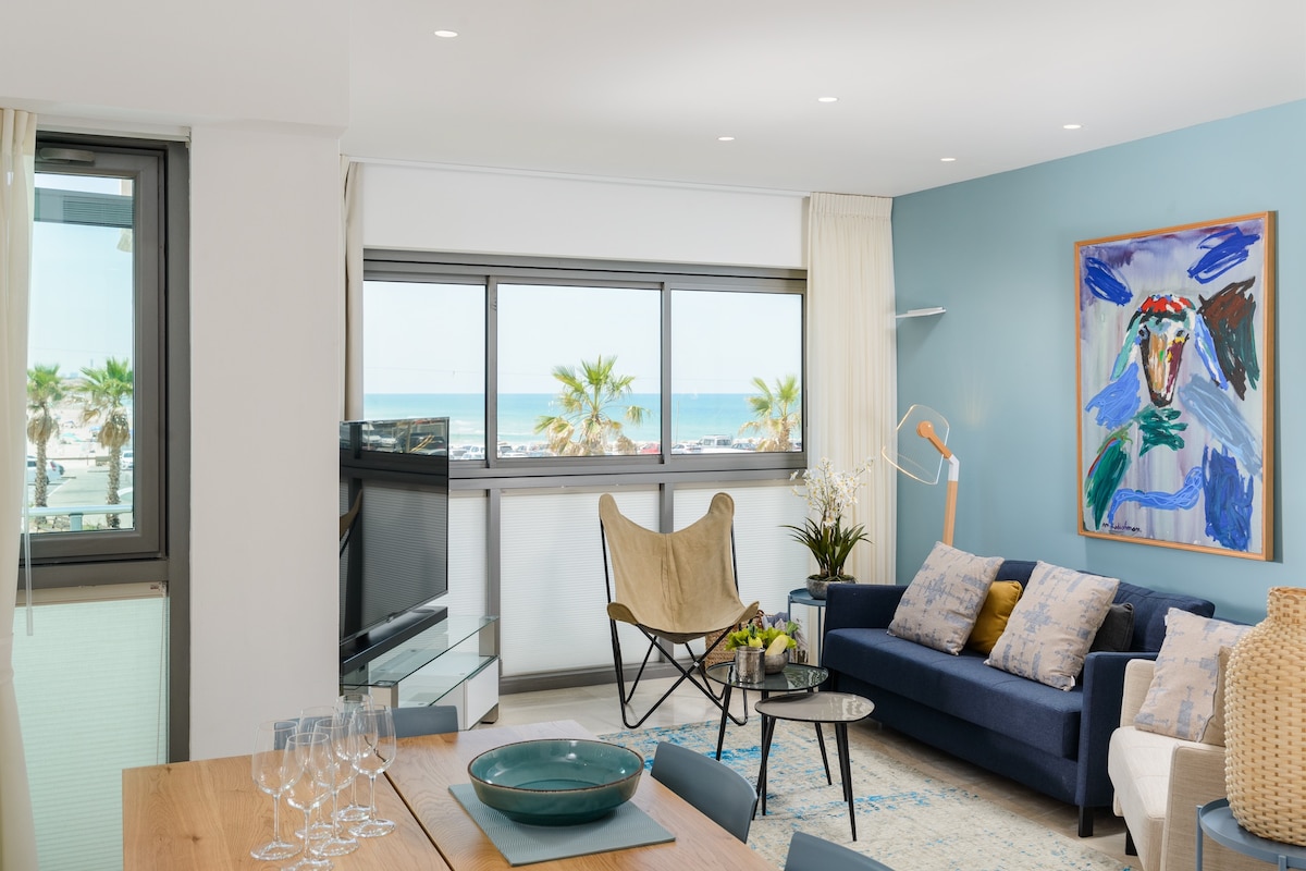 Apartamento deslumbrante de 1 quarto e varanda recentemente redesenhado e totalmente remodelado, acomoda até 6 pessoas, vista direta para a praia e para o mar, cozinha totalmente equipada, televisões inteligentes 4K HD de 65"+50", Wi-Fi gratuito, estacionamento gratuito, recepção/segurança 24/7 em Okeanos no edifício da marina, adjacente às belas praias de Hertzeliya, a poucos minutos de Tel Aviv. Perfeitamente situado a poucos minutos a pé de restaurantes e lojas na marina, a menos de 5 minutos do Vale do Silício de Hertzeliya, a 30-40 minutos do campo de golfe Caesarea, 45-55 até Jerusalém.