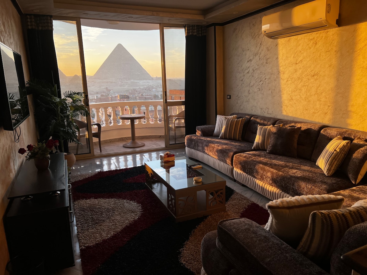 Bem-vindo (a) ao nosso apartamento! A apenas 5 minutos a pé da entrada da Esfinge e das Pirâmides, com uma vista deslumbrante para a varanda. Localizado numa área local segura e animada perto de restaurantes, cafés, lojas de frutas, mercados e farmácias. O apartamento é totalmente climatizado, com Wi-Fi rápido e ilimitado, uma cozinha bem equipada, lençóis limpos, toalhas limpas e um ambiente calmo. Provavelmente o melhor lugar para desfrutar da vista para as Pirâmides!