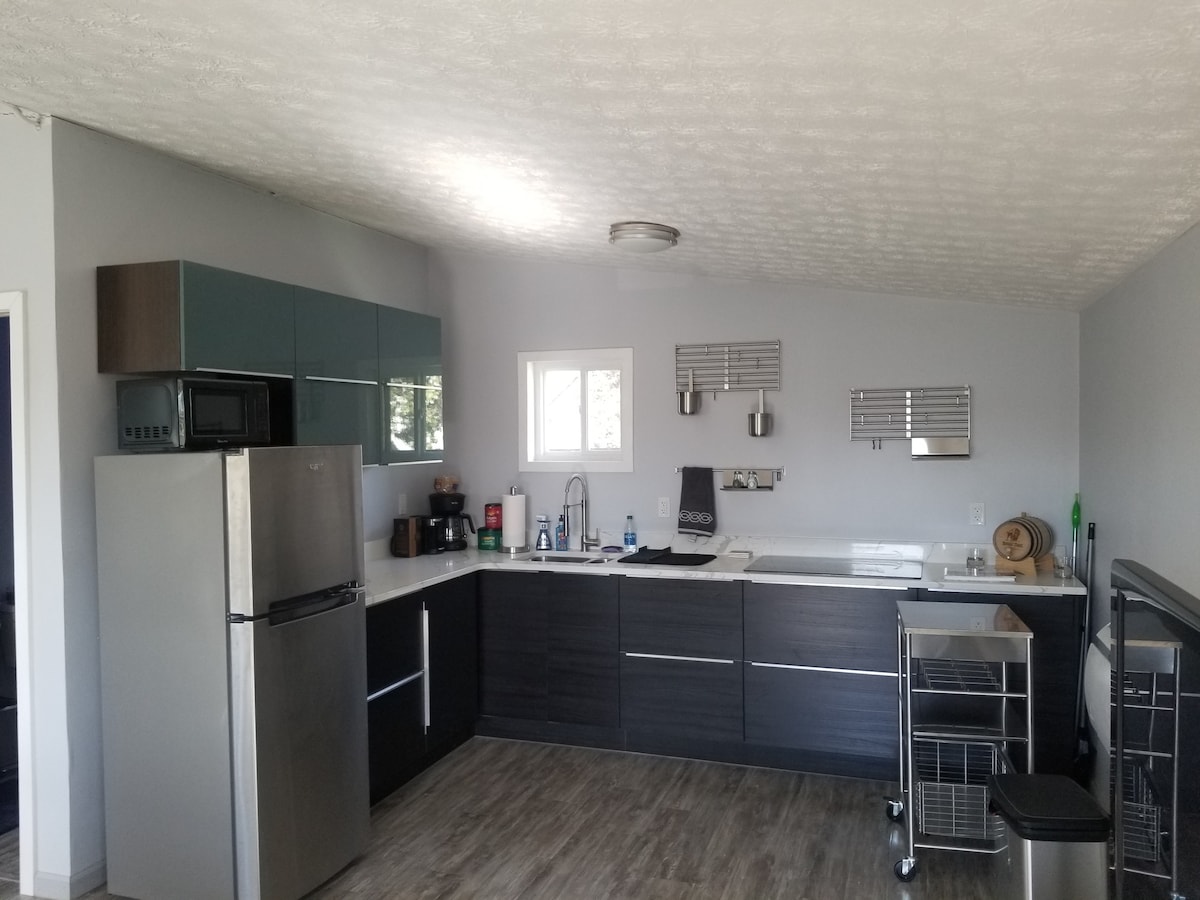 O quarto é uma eficiência independente com uma cozinha acoplada, cortinas blackout e cama queen reclinável. Tem uma vaga de estacionamento designada e entrada separada. A unidade tem banheiro privativo e closet, e cozinha. Também tem geladeira, cafeteira, micro-ondas, escrivaninha, TV smart de 42", forno Ninja airfryer e sofá. Varanda privativa com mesa e cadeiras. Vaga de estacionamento única fechada/segura.