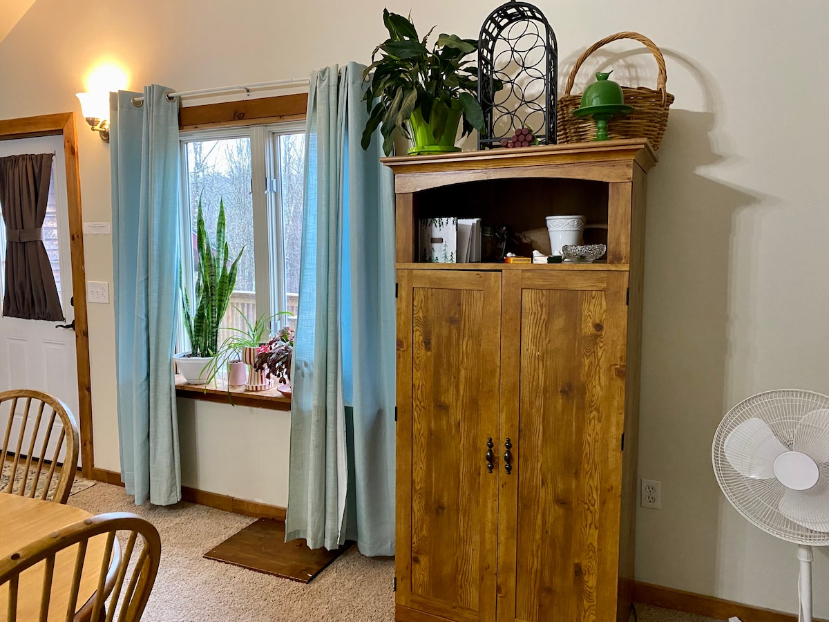 Apartamento estúdio privado num ambiente florestal com um pátio acolhedor localizado numa estrada de terra sem saída. A poucos passos da Floresta da Cidade de Hinesburg, de 836 acres, com algumas das melhores trilhas de mountain bike, raquetes de neve e caminhadas. Perto de muitas áreas de esqui descendente, sertão e cross country, incluindo Bolton Valley, Sleepy Hollow, Camel's Hump, Mad River Glen, Sugarbush & Smuggler 's. A 30 minutos de carro de Burlington para ótimas compras ou uma noite na cidade. Também é um lugar maravilhoso para relaxar.