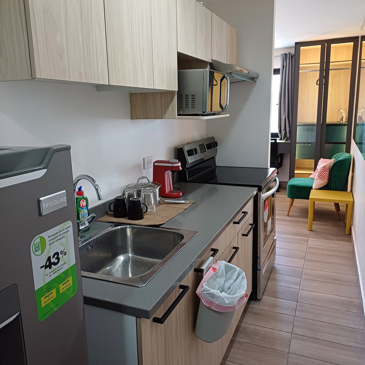 Un moderno apartaestudio, (monoambiente) con excelente vista de la ciudad en uno de los edificios más exclusivos de la zona, en una zona con alta plusvalía, si buscas seguridad, comodidad y accesibilidad lo encontrarás en él. El edificio cuenta con guardias de seguridad 24/7, parqueo gratuito, cuenta con áreas de esparcimiento al aire libre. Es importante mencionar, en caso de irse la energía, el edificio cuenta con planta generadora.