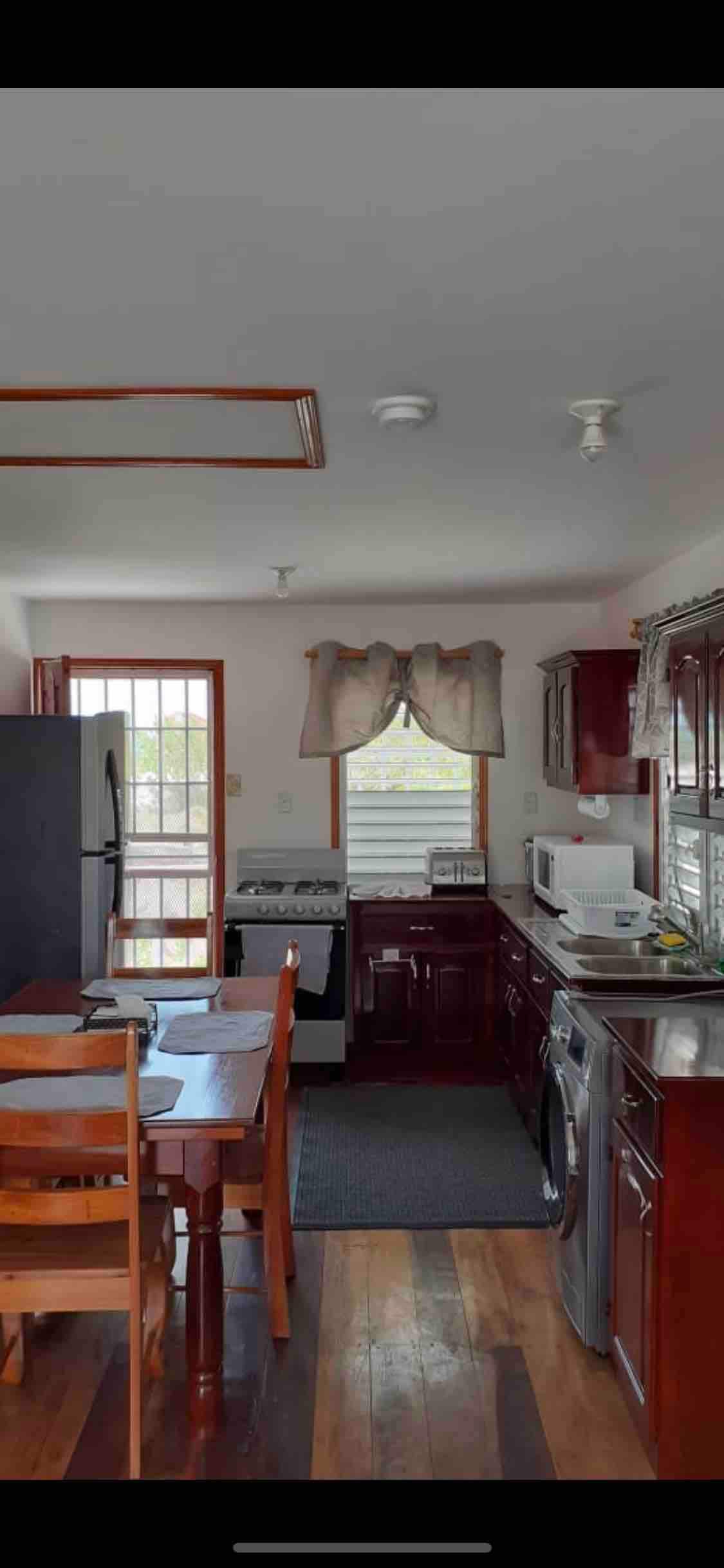 Este impressionante apartamento de 680 pés quadrados, no segundo andar, localizado no centro da Orange Walk Town, tem uma cama king size macia com ar condicionado no quarto, a cama inflável queen permite que até 4 hóspedes fiquem neste apartamento que tem uma cozinha feita para cozinhar regularmente e uma área de sala de jantar para até 7, ao lado dela, a sala de estar que tem uma Smart TV que está conectada aos apartamentos Wifi. A varanda permite uma vista para o belo parque!