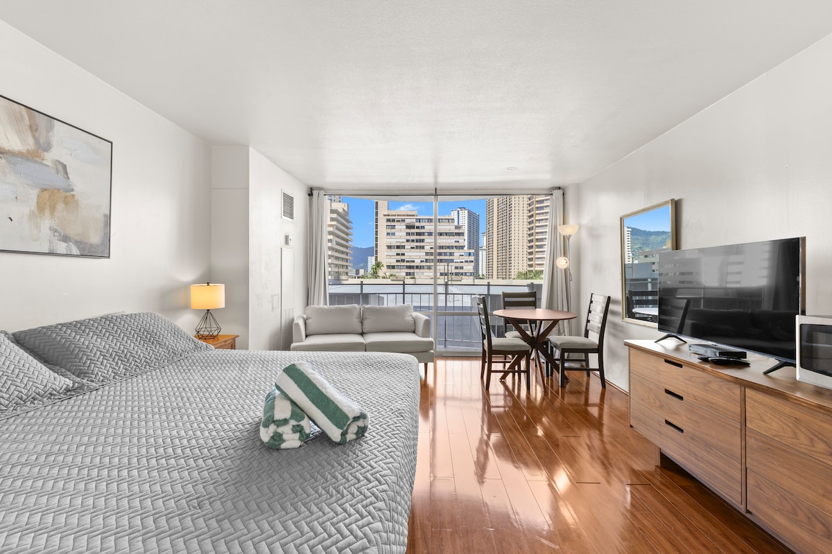 Estúdio de luxo com cama king na praia no coração de Waikiki