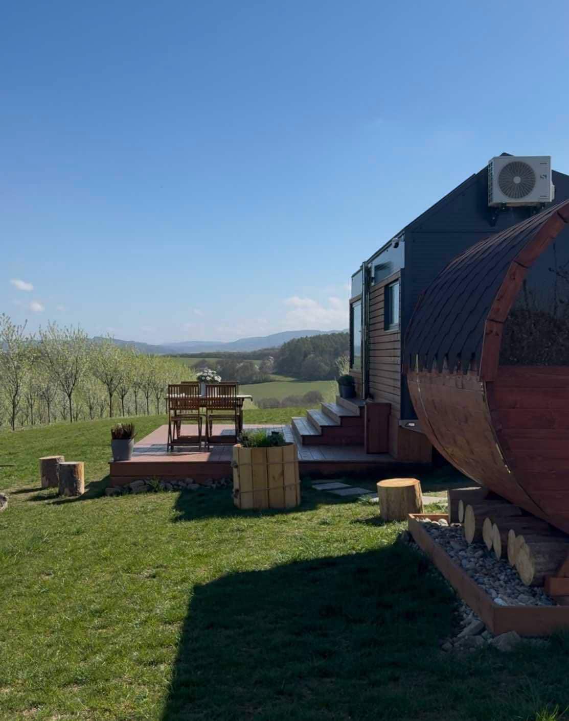 Construída por nós mesmos, desde as fundações até os móveis de interior feitos à mão. O ambiente ao redor da casa foi modificado para o seu conforto: terraço com espreguiçadeiras e banheiras para banhos de verão, banheira com água aquecida para os dias de primavera e primavera e outono, área de estar ao ar livre em um terraço parcialmente coberto ao lado de um pequeno lago, área para churrascos ou grelhados. E vegetação plantada por toda parte. Queria que os hóspedes experimentassem a qualidade e o conforto tanto visualmente quanto na própria pele.