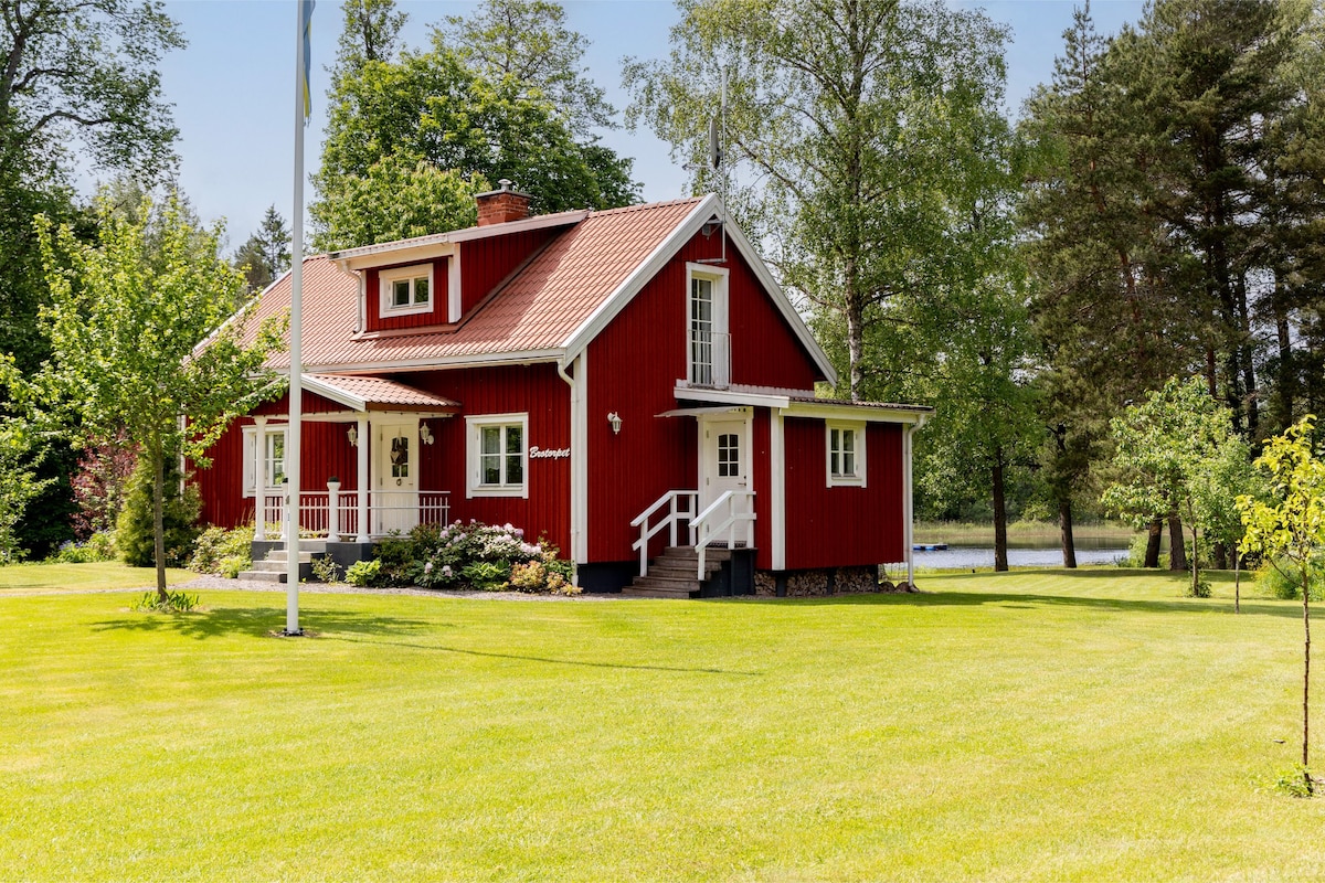 Uma casa de campo de bom gosto com cama de casal num quarto de dormir e até cinco colchões num loft espaçoso. Sauna e varanda, churrasqueira, mobiliário de jardim, parque infantil. Vida agradável e tranquila no campo. Trampolim, muitos jogos e livros. Um ótimo espaço para crianças! A 200 m do local de banho com barco. Esta casa está situada perto da minha própria casa, seremos vizinhos durante a sua estadia. É bem-vindo! 25 minutos até Astrid Lindgrens World. Estão disponíveis guias sobre os arredores na Basebo förlag.