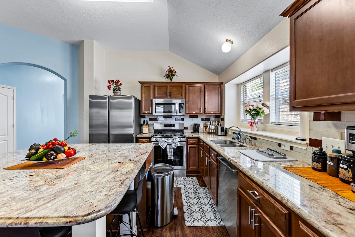 🍃A Casa Granada é a casa de férias perfeita para famílias e grupos - moderna e acolhedora! As nossas portas de vidro deslizantes do chão ao teto revelam o nosso grande quintal privado. Tornando esta casa verdadeiramente única. A poucos minutos de distância de The Woodlands e lojas na Market Street. Desfrute de uma noite com as nossas luzes Philips para definir o clima perfeito. Também pode trabalhar remotamente ou ir ao ginásio em casa! WI-FI/TV/ESTACIONAMENTO/AR CONDICIONADO CENTRAL/MÁQUINA DE LAVAR/SECADORA/PÁTIO/GINÁSIO **Para um grelhador: deve ser solicitado 24 horas antes do check-in