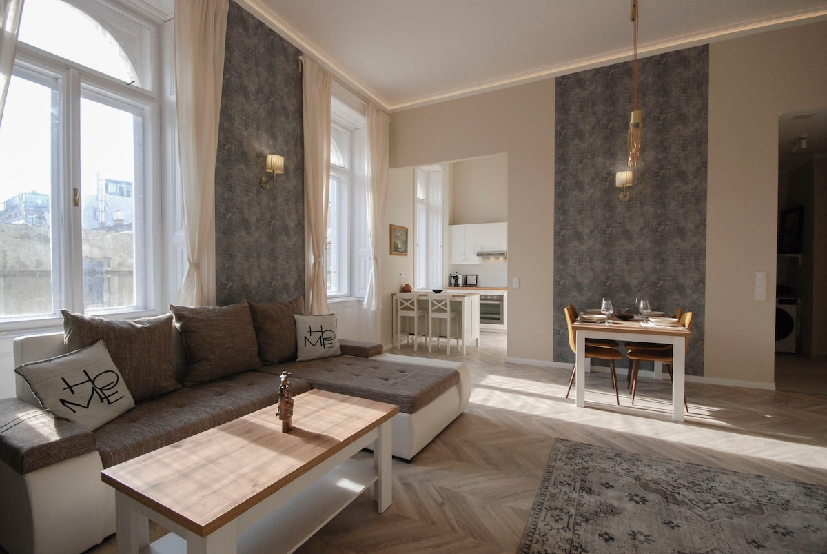 Luxury 2-Bedroom, 2-Bathroom Apartment in Central Budapest Stylish apartment with premium furniture, spacious living room, dining area, fully equipped kitchen, and high-speed internet. Surrounded by top restaurants, cafes, and bars — the perfect base to enjoy the city. 🐾 Pets welcome: one dog only, €30 pet fee. 🅿️ Private garage parking 150m from the apartment. Complimentary access to Spa & Gym (600m away) for bookings over €150/night/ from 2 nights reserv. 🛗 2nd floor with elevator