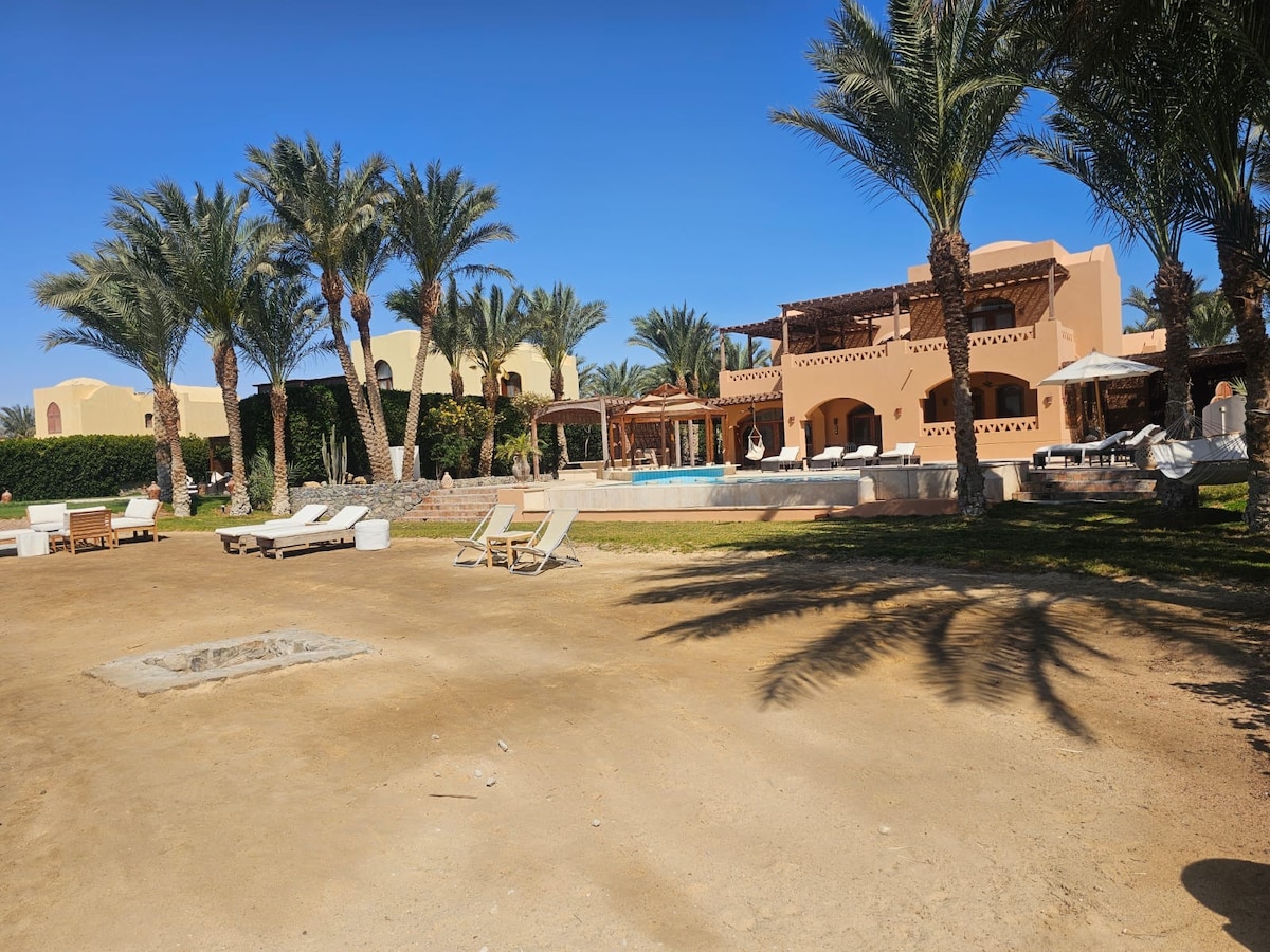 Será transportado para o jardim do Éden assim que passar pelo portão a partir das ruas movimentadas e empoeiradas de Central Hurghada. Esta casa de campo única, aninhada à sombra de árvores num grande jardim, é o refúgio perfeito para descansar a sua mente e alma. A grande e sombreada sala de estar exterior oferece abrigo e conforto para encontros com amigos e familiares. O jardim parcialmente sombreado oferece muito espaço para banhistas e amantes da sombra.