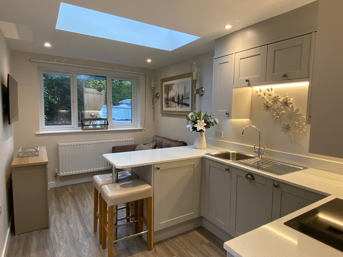 Adorável apartamento estúdio com estacionamento na entrada, perto do centro da cidade de Guildford. Cama king size, cozinha equipada com forno/micro-ondas, frigorífico, máquina Nespresso, smart tv e casa de banho com chuveiro eléctrico. Estamos localizados numa área muito tranquila, mas a poucos minutos de carro do centro da cidade de Guildford. O nosso jardim faz fronteira com o caminho de North Downs, ótimo para os caminhantes. Entrada privada (subindo um lance de escadas) e estacionamento gratuito atrás de portões elétricos. Leite, café com chá, etc., e qualquer outra coisa que precise.