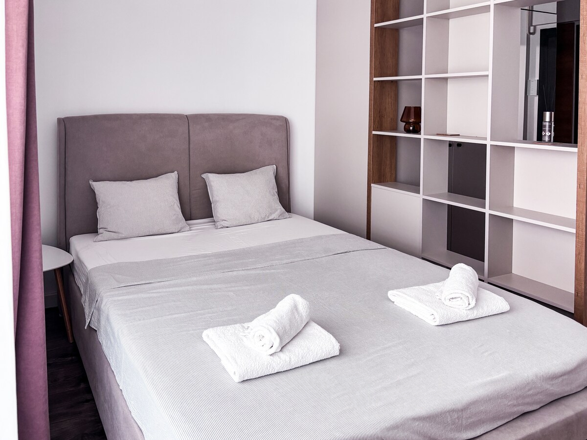 Este estúdio elegantemente decorado está situado numa área recém-desenvolvida, a apenas 7 minutos de carro do centro da cidade (Centro Comercial Palas). O edifício foi concluído em 2019 e todos os móveis são novos. Fica perto de tudo! O centro comercial Iulius fica a apenas 2 minutos, lojas e cafés ao virar da esquina. Ótimo para casais, trabalho remoto, até mesmo para os seus amigos peludos! ⋆ Estacionamento GRATUITO na rua Wi-Fi GRATUITO de alta velocidade ⋆ Smart TV + cabo ư A/C ư frigorífico grande Máquina de lavar roupa ⋆ Varanda grande com vista