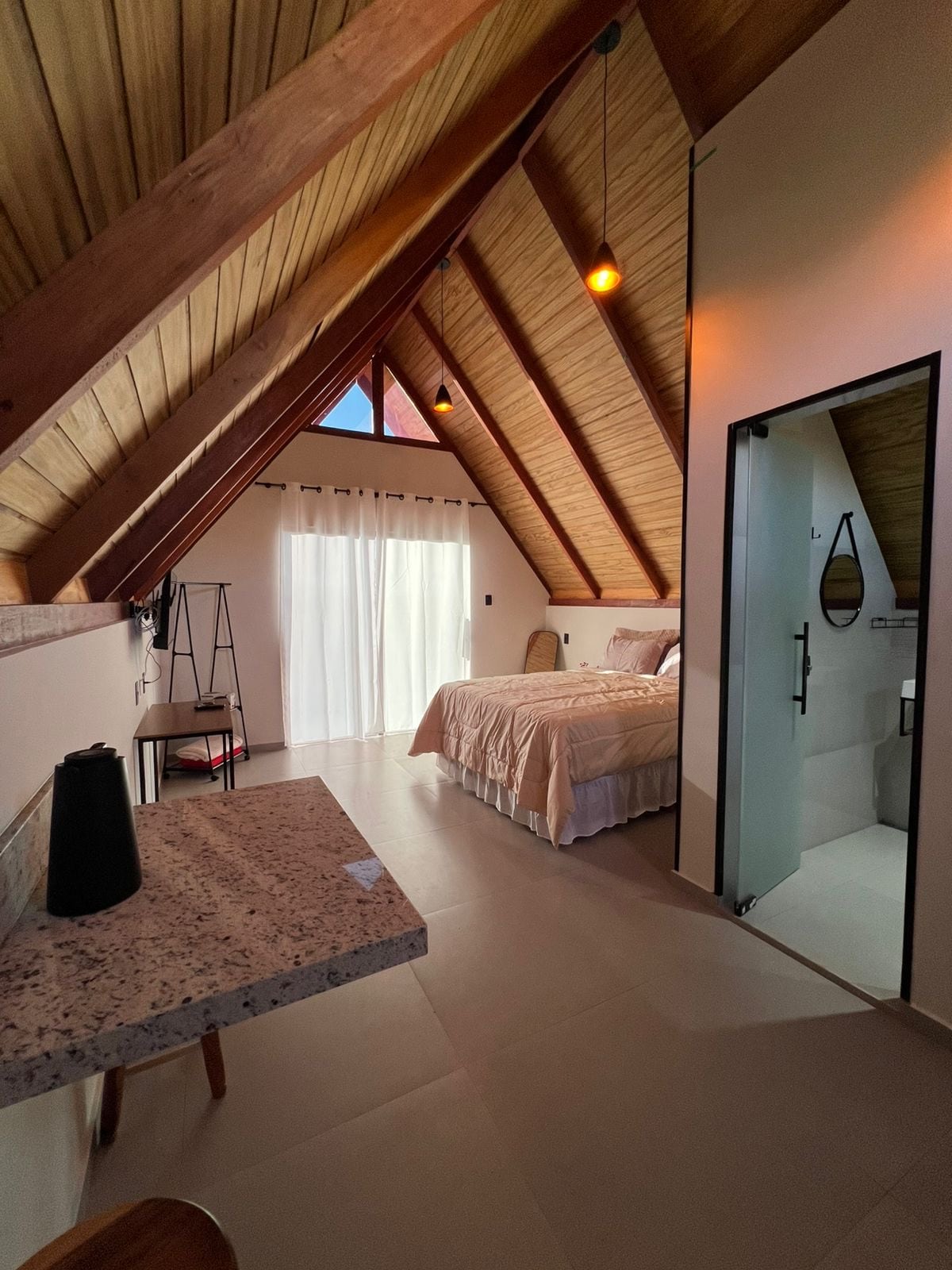 Chalé super aconchegante, bem decorado, cozinha totalmente equipada. TV, internet, varanda com redes. Janeloes em todos os ambientes com vista pra serra, inclusive do chuveiro. Tome um vinho ao lado do fogo de chao olhando as montanhas, ou no deque com vista impar. Medite na capelinha ou na beira do rio que corta a propriedade. Relaxe em uma das diversas redes espalhadas pelo Porto Janelas.