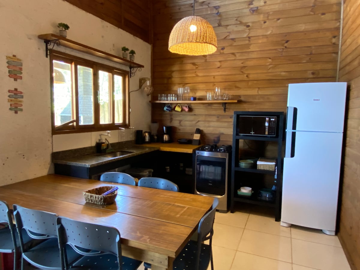 Nosso bangalô é uma opção perfeita pra um casal que quer descansar em um lugar privilegiado... Venham conhecer nosso espaço privativo, sossegado e conectado com a natureza, na frente da lagoa de Ibiraquera. O melhor lugar da lagoa pelo por do sol ! Fica a 700m da praia, e 300m do centrinho. Sua mascota está bem vinda ! Wifi com fibra de 100 Mo Smart TV Churrasqueira privada na frente da lagoa Oferecemos também aluguel de SUP, aulas de windsurf e hydrofoil com Yann Espaço independente