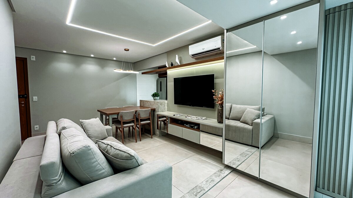 🤩 Condomínio novo ❗️Um Ap único, elegante e sofisticado, feito para você se sentir em casa. Assista seu filme favorito no quarto ou na sala na mais moderna Smart TV giratória com ambiente com ar condicionado, mesa de jantar e espaço de trabalho dedicado. Repouse na melhor cama, delicie-se do chuveiro mais gostoso, aprecie a varanda e uma lindo por do sol com vista para o parque e desfrute do contemporâneo Setor Bueno na melhor região de Goiânia ! Condomínio Tai Residências