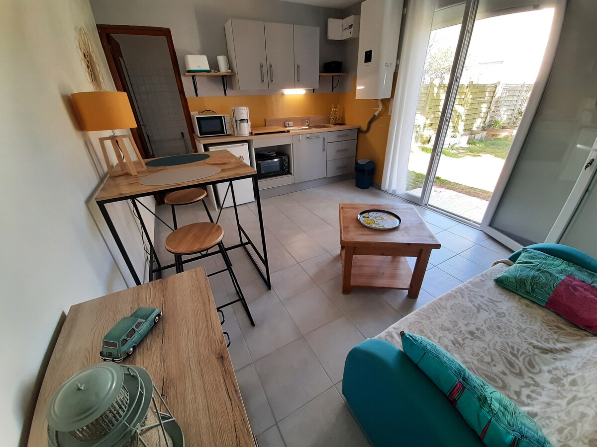 Idealmente localizado na entrada de Ile-Tudy, a 5 minutos a pé da praia, oferecemos-lhe uma pequena casa de campo no nosso jardim. Tem um quarto com uma cama de casal, uma sala de estar com uma kitchenette e uma pequena casa de banho. Ideal para 2 pessoas, localização tranquila, empréstimo de 2 bicicletas para os seus passeios à beira-mar e pequeno terraço à sua disposição.