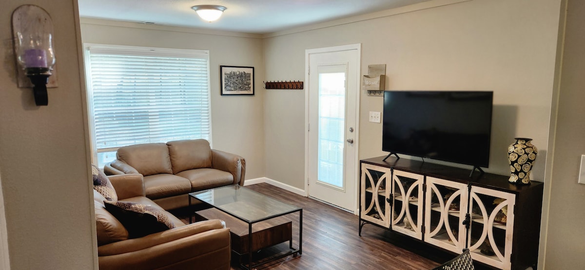 Casa de campo alegre de 2 quartos a 6 km de estádios com estacionamento gratuito no local. Ideal para famílias com uma sensação de campo perto da cidade. A casa de banho tem um chuveiro com box. Grande cozinha totalmente abastecida com área de jantar separada. Frigorífico com gelo e água pela porta. A cozinha tem uma máquina de lavar louça e uma máquina de lavar e secar roupa. Além de um bónus adicional, um café totalmente abastecido. Também é adicionado um recipiente EV de 240 volts para carregar EV durante a noite.