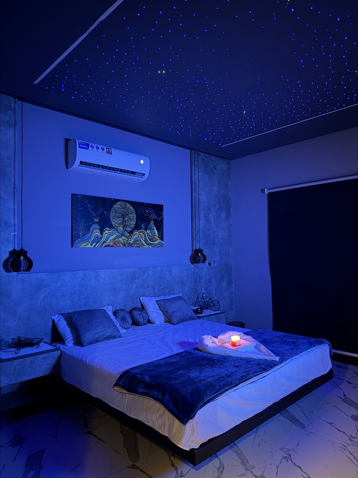 Floating bed, starlit ceiling & elevator access — Multan’s most aesthetic 1-bed stay. Escape Aura – Luxury Stay in Buch Villas, Multan Experience Multan’s first aesthetic apartment with a starlit ceiling, floating bed, and elegant dark-light theme. Enjoy full privacy with self check-in & check-out. Located in Buch Villas, just steps away from Imtiaz Mega Mart, Universal Cinema, and Buch International Hospital. Family & verified guests only. No unmarried couples / no parties.