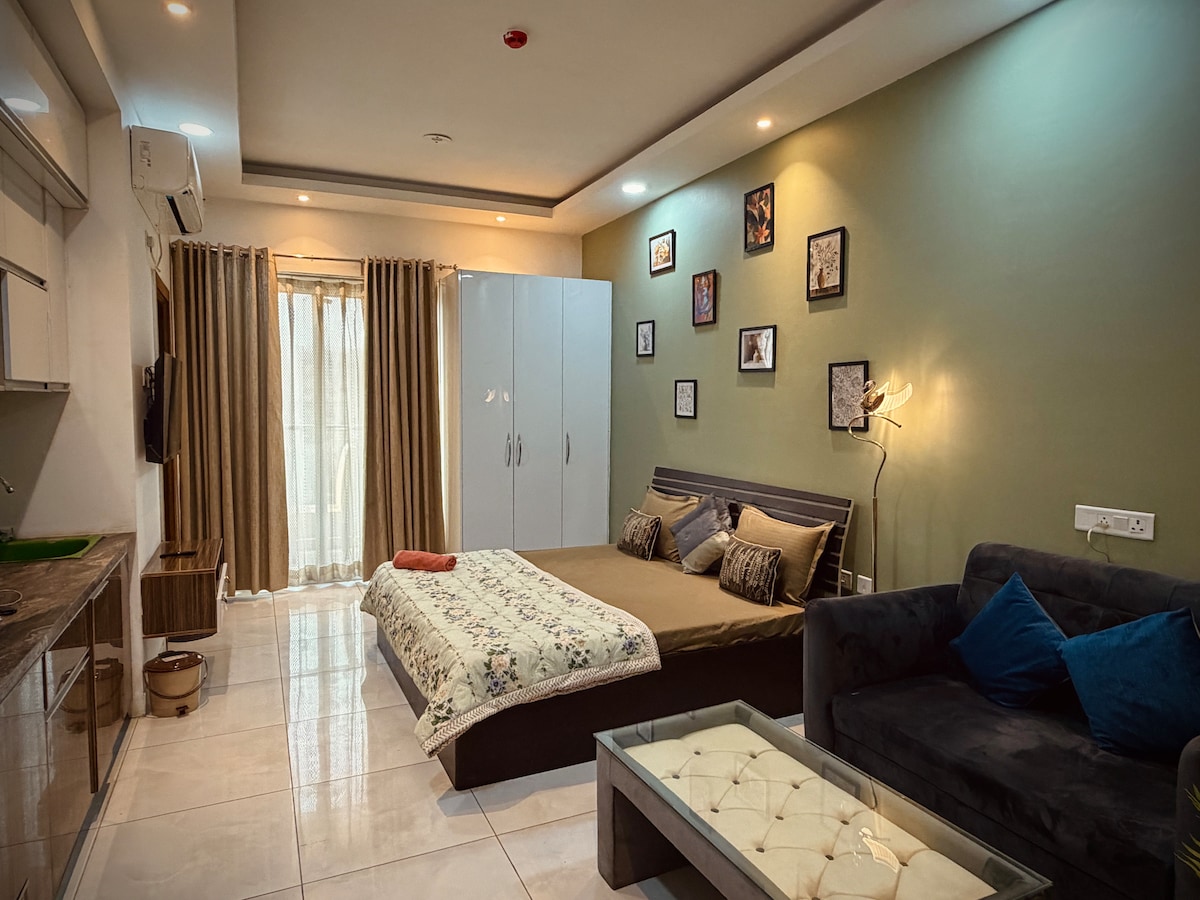 A couple friendly Private apartments with stunning views, a king-sized bed, and a fully-equipped kitchen. Enjoy seamless connectivity with fast WiFi and stay entertained with our sleek smart TV with free access to OTTs. Complimentary amenities include an Electric Kettle, Microwave, Induction cooktop and toiletries - your home away from home! Daily cleaning is available and the timings are (11 AM to 6 PM) Compulsory ID proof (Adhaar/DL/Passport) required for all guests before check-in.