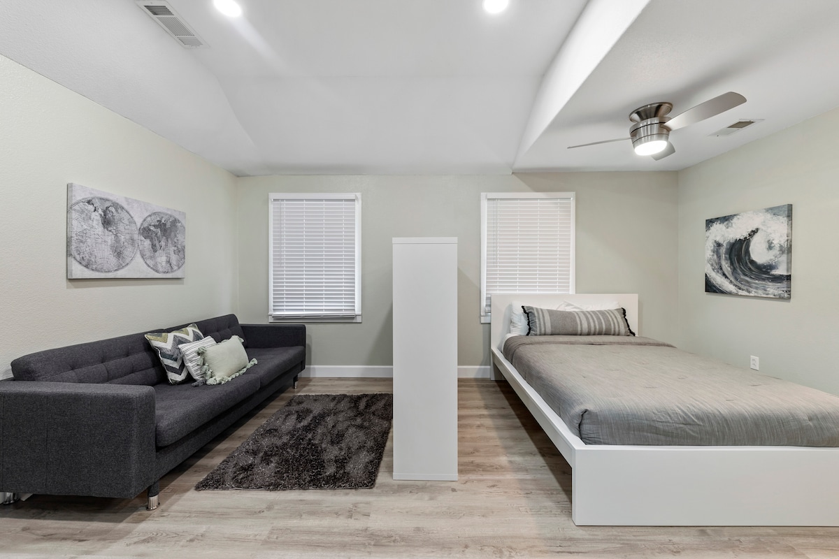Fique no coração da histórica Georgetown neste estúdio moderno recém-construído, a poucos passos da praça e do San Gabriel River Trail. Caminhe até lojas, cafés e restaurantes, ou passeie um quarteirão até ao Blue Hole e ao San Gabriel Park. Este elegante estúdio privado tem uma casa de banho completa, kitchenette, máquina de lavar e secar roupa e estacionamento dedicado. Ideal para casais ou viajantes individuais que procuram conforto, facilidade de caminhar e o melhor do centro de Georgetown. Descontos semanais e mensais incluídos.