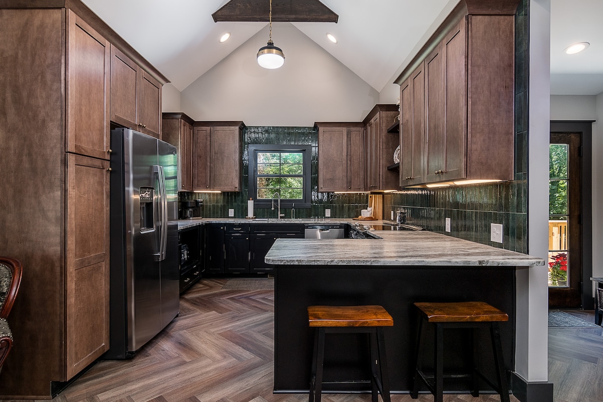 FRENTE AO LAGO, construído sob medida em 2018. Aninhado em meio às árvores, você vai desfrutar da nossa casa de hóspedes privada. Inclui: 1 quarto com cama queen size, banheiro completo com chuveiro, quarto grande e elegante com cozinha totalmente equipada. Inclui também uma grande varanda ao ar livre com teto abobadado e luzes do céu. Desfrute de pesca, natação, caiaque e passeio de pedal boat a partir do cais do proprietário. Restaurantes e atividades a poucos minutos de distância. Carregamento de veículos elétricos disponível no local. A casa de hóspedes é uma estrutura separada com seu próprio HVAC.