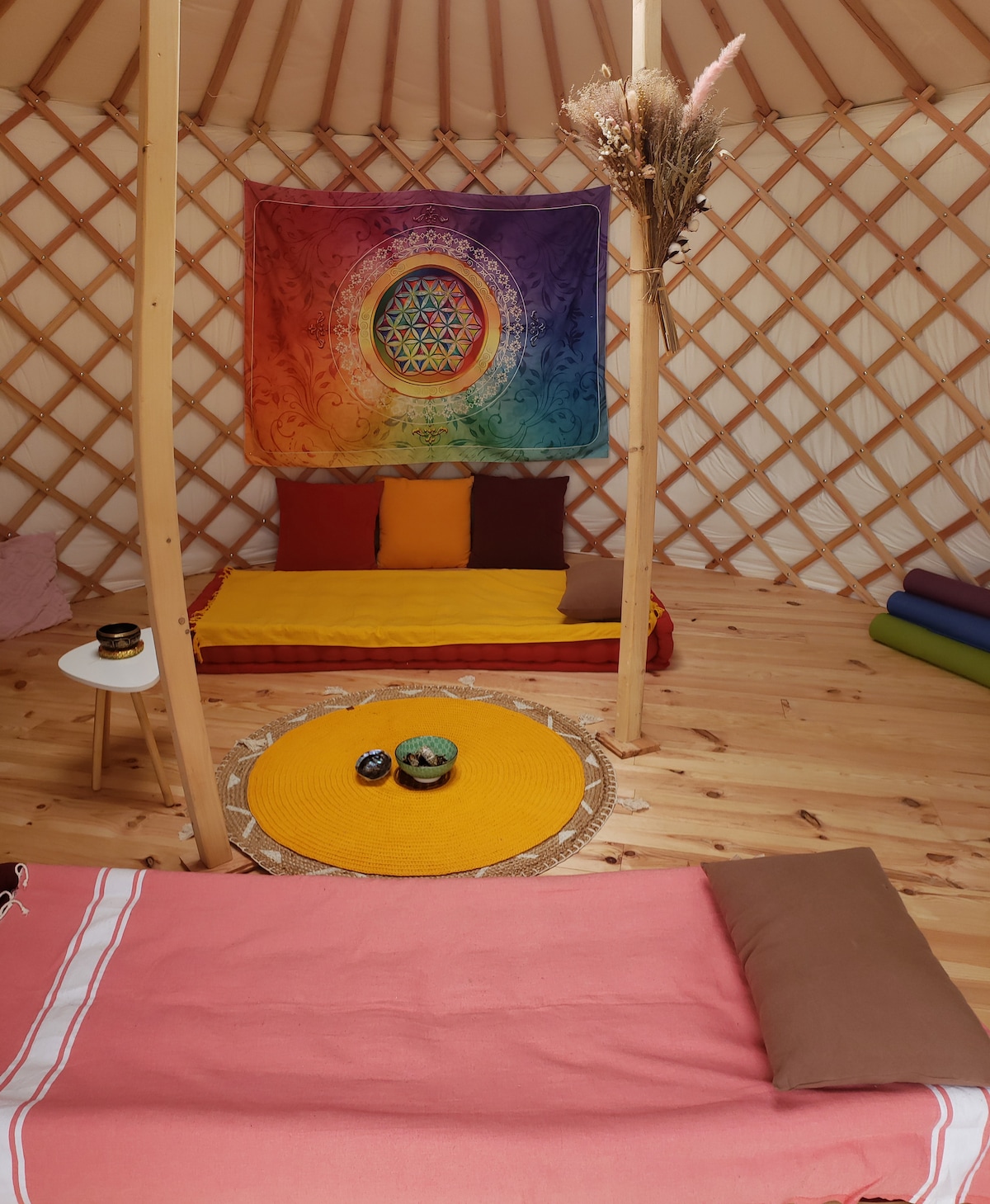Esta habitação circular está imersa em plena natureza. No local, você pode aproveitar a nossa piscina de contêineres e a pureza da sua água natural. Atividades relacionadas ao bem-estar, como ioga, sofrologia, etc., podem ser oferecidas, de acordo com a programação. A tenda é composta por 4 camas de solteiro de 70 cm que podem ser unidas para formar uma cama de 140 cm. Você terá acesso a um espaço compartilhado para a cozinha e o banheiro que fica do lado de fora perto da piscina.