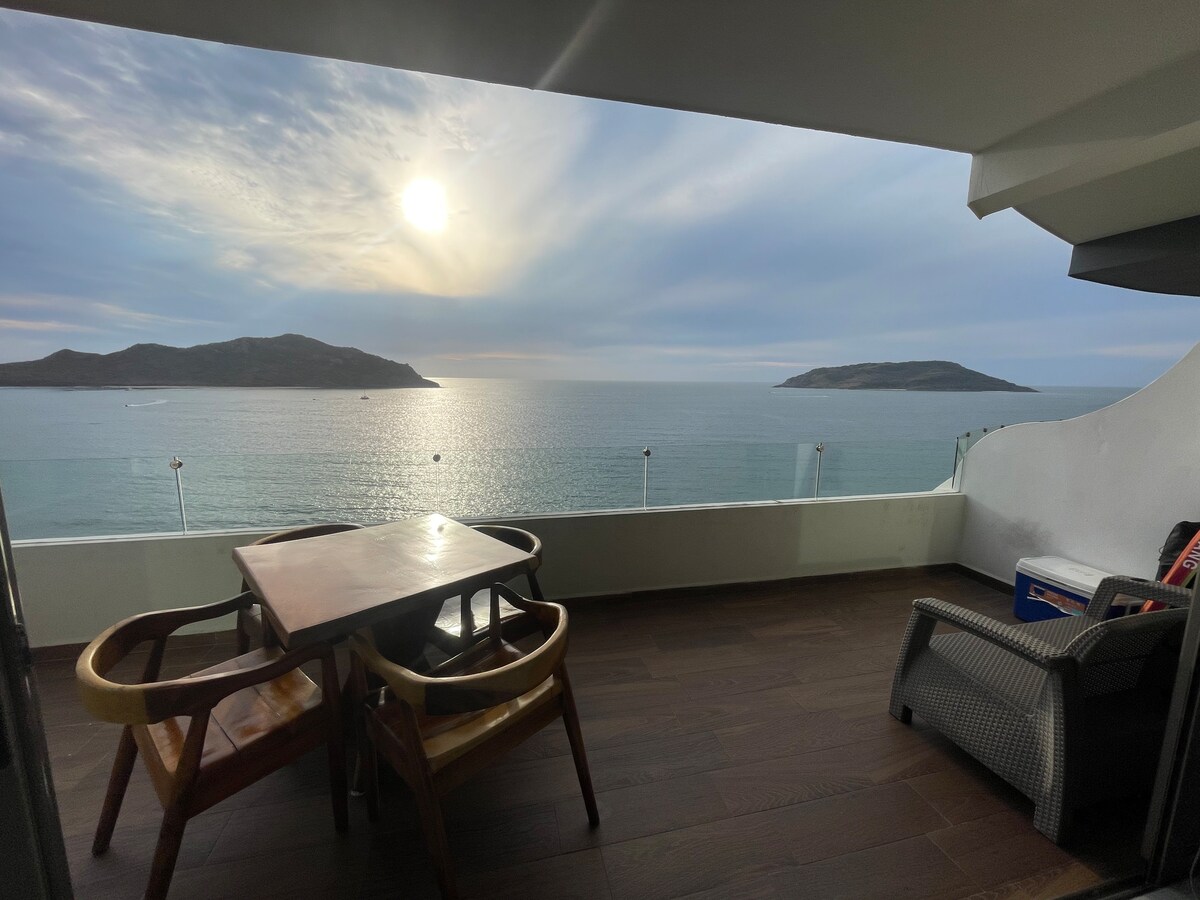 Condomínio moderno na frente da praia com uma das vistas mais espetaculares de toda Mazatlan. Completo com uma sala de estar espaçosa aberta, cozinha, duas camas dobráveis, dois banheiros completos, WI-FI e TV a cabo. O condomínio inclui uma varanda na qual você pode relaxar e desfrutar de um lindo pôr do sol. Outra vantagem seria a piscina de borda infinita, jacuzzi, academia e spa, tudo gratuito. Além da vista incrível, também há muitos restaurantes, a praia, locais históricos e muitas outras atividades a poucos minutos de distância.
