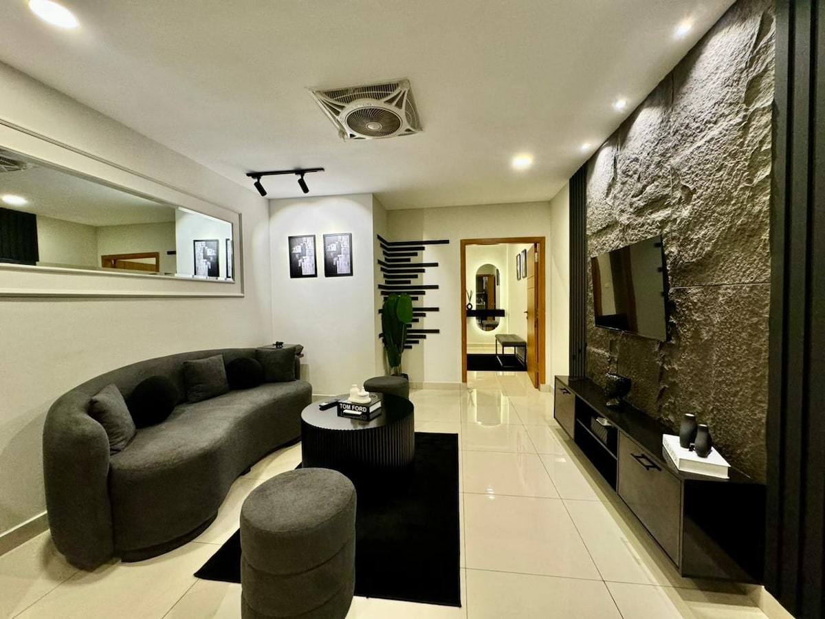 Projetado com muito cuidado por um designer de interiores, o The Black H vem com um espaçoso lounge e quarto, uma enorme televisão LED de 60 polegadas, um sofá de 10 lugares, uma cozinha totalmente equipada e uma peça de decoração distinta – um crânio de um íbex (de origem ética) – que adiciona um charme rústico ao espaço. Está localizado em Bahria Heights 1 Bloco D, um dos padrões de vida mais premium mantidos pela cidade de Bahria. Todos os principais restaurantes e cafés estão nas proximidades e o edifício tem segurança 24/7