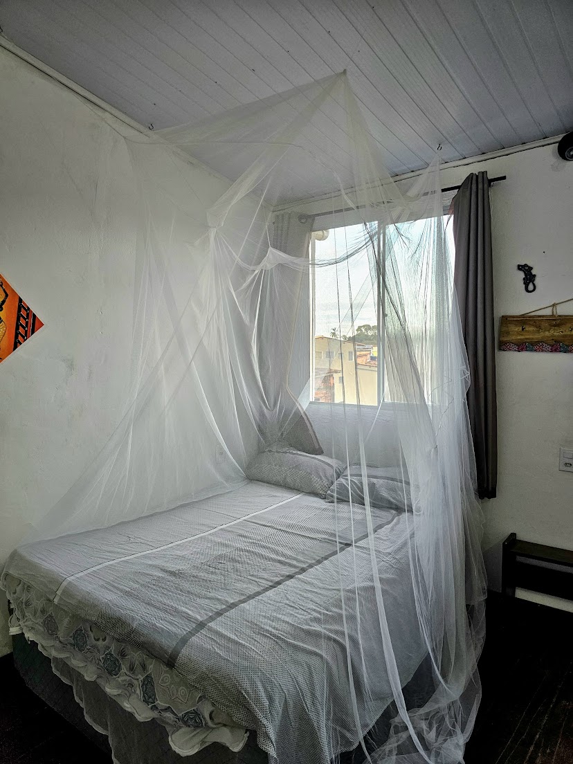 Sinta-se abraçado pela natureza em nosso refúgio no Alto da Mata. A varanda, com sua churrasqueira e mesa ao ar livre, é seu camarote exclusivo para o espetáculo diário do pôr do sol sobre a copa das árvores. O conceito aberto cria um ambiente único e integrado, perfeito para criar memórias em um cenário de tirar o fôlego, a poucos minutos do centro de Itacaré.