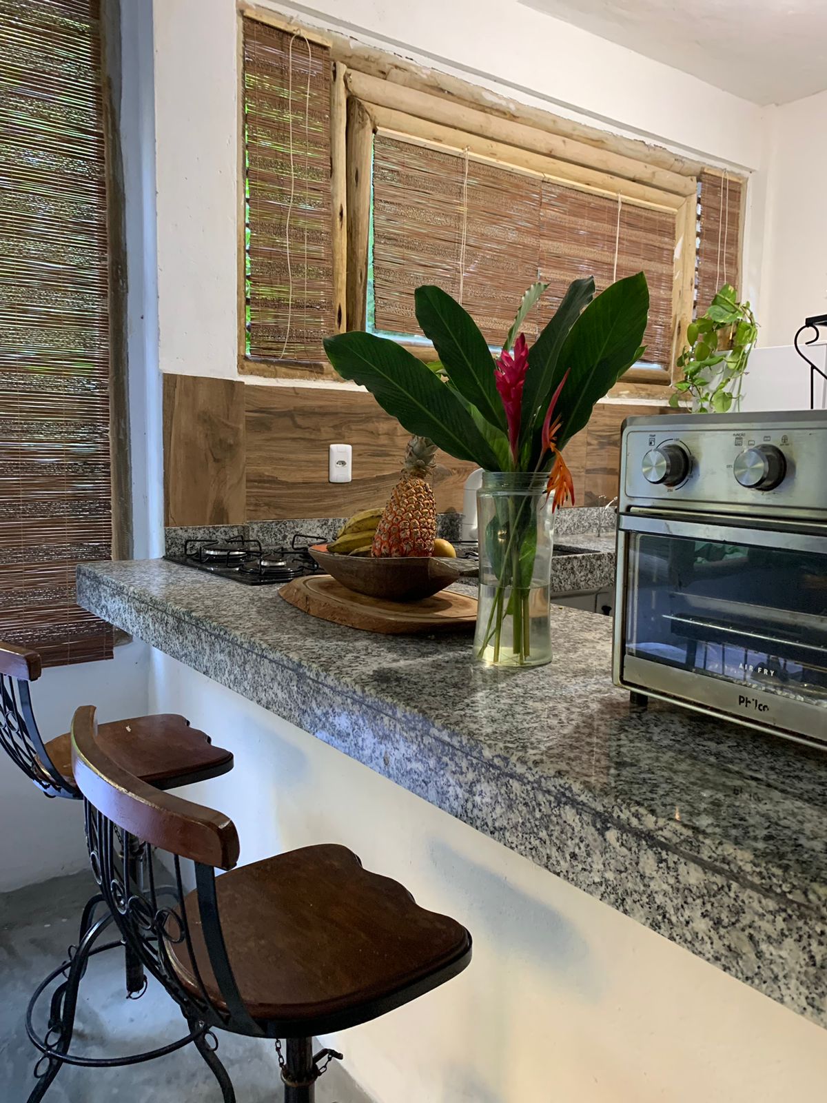 Loft luminoso e arejado no 2º andar, pode acomodar confortavelmente 4 pessoas em volta da sua elegante e estilosa cozinha latino-americana e do seu lounge descolado e colorido. Uma suíte oferece ar e varanda com puffe e rede, enquanto a outra com ventilador colonial reserva uma experiência mais intimista com sua alcova de madeira, banheiro em espiral e janela de muxarabi lembrando a Índia. No lounge, 2 sofás podendo se transformar em camas. Vista para nosso deslumbrante bananal e para mata.