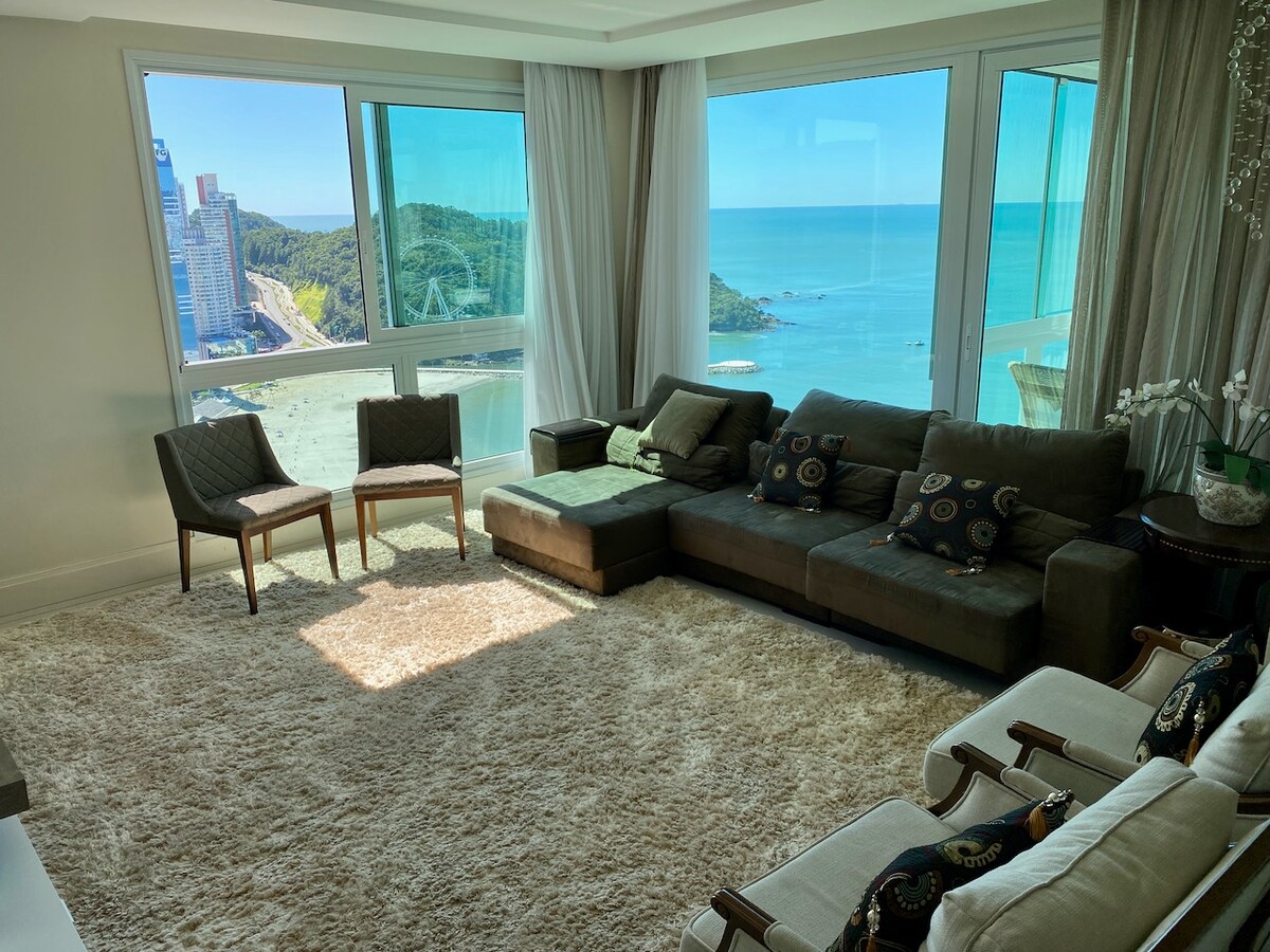 NOVO- RECÉM REFORMADO. Muito conforto, último andar, uma cobertura de revista com uma vista deslumbrante. Decorada com muito requinte e sofisticação. Totalmente equipado, 2 vagas na garagem, 2 piscinas (abertas no verão), 180m2 privativos no 28° andar com a melhor vista de Balneário Camboriú! Telas nas janelas dos quartos, berço e banheira para bebês! Na melhor localização da beira mar, em frente à Ilha, perto dos principais restaurantes da orla. Mercados, padarias e farmácias próximos.