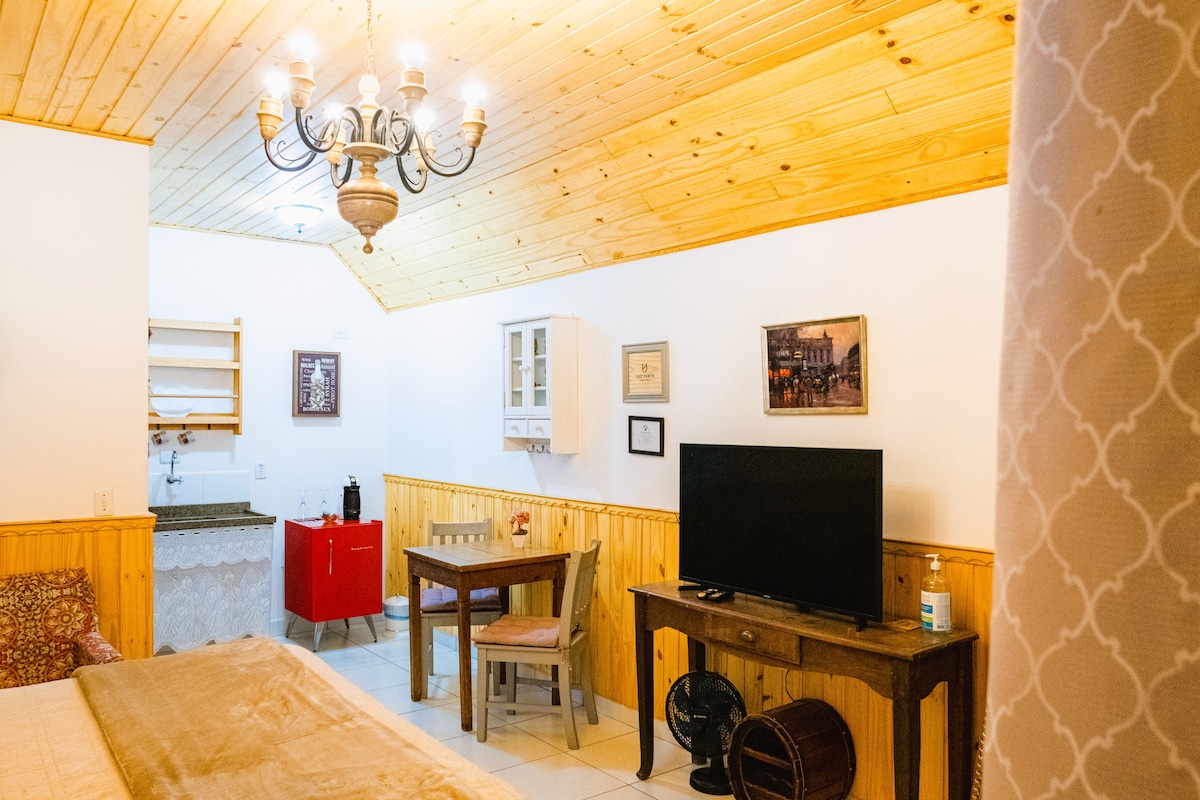 Sejam Bem-Vindos(as) - Studio Essential. -Em 6 X S/JUROS -Fechadura Eletrônica -Estacionamento gratuito - Sem vaga demarcada -Studio - Piso Superior -Conceito Industrial - Com madeira, tijolinho e metalom -Internet com Wi-fi - 600mb -Smart TV 32' - Streamings inclusos -Enxoval Cama - Completo -Enxoval Banho - Completo -Amenities - Shampoo/Condicionador/Sabonete -Cozinha - Compacta, exclusiva e utensílios inclusos -Lareira - Literalmente aos pés da cama -Chuveiro Deca - 12L/min. à Gás