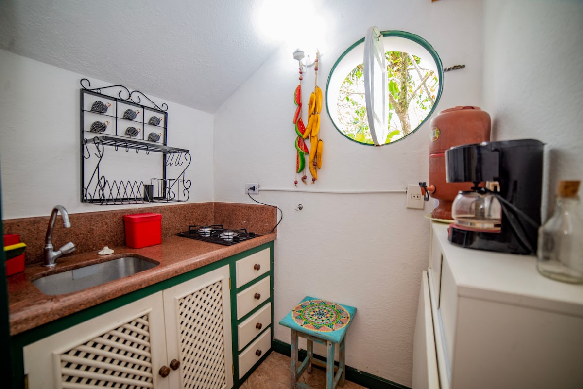 Casa ecológica de bambu e barro, simples, mas charmosa. Perto da praia, rua asfaltada e fácil acesso, quintal e garagem compartilhada. Moramos na casa da frente e a casa de bambu é nos fundos. Quarto/sala, banheiro, copa, cozinha, área de serviço e jacuzzi. Café da manhã vai estar disponível na cozinha para ser preparado pelo próprio hóspede no horário que desejar (frutas, pães, frios, café, leite, manteiga, requeijão, ovos e bolo) Temos bicicletas a disposição dos hóspedes. Passeios opcionais.