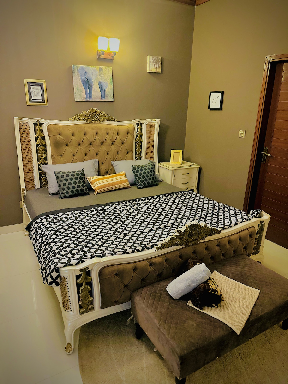 Fique em grande estilo neste luxuoso apartamento de 3 quartos na Shaheed-e-Millat Road, Karachi. Projetado pela renomada designer de moda Sofia Naveed Lari, o apartamento apresenta interiores elegantes, quartos com casa de banho, um espaçoso salão com Smart TV de 65", área de jantar e uma cozinha totalmente equipada. Com uma localização central perto de Habitt City, Tariq Road, PECHS e dos principais restaurantes, e com acesso próximo a DHA/Clifton, é ideal para famílias, grupos e viajantes de negócios.
