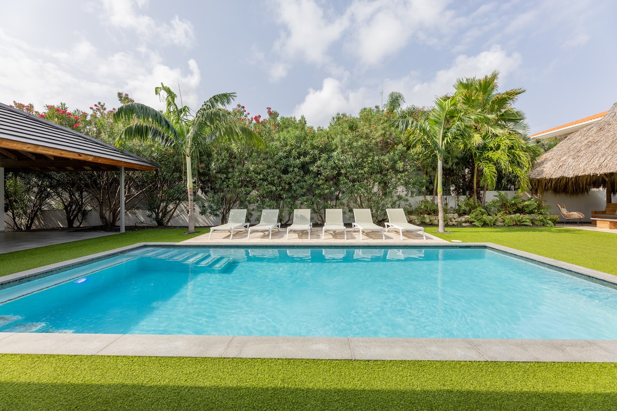 Luxe droomvilla met zwembad in Vista Royal-Jan Thiel. Voorzien van 3 ruime slaapkamers met elk een badkamer en daarom geschikt voor max. 6 personen. Villa met comfort en privacy op perfecte locatie gelegen op loopafstand van Jan Thiel Beach, supermarkt, sportschool, bars en restaurants. Lekker dineren op de grote veranda en relaxen onder de palapa bij het fraaie privé zwembad. Voorzien van TV met alle zenders, WiFi en alarminstallatie. Parkeerruimte op eigen terrein achter elektrische poort.