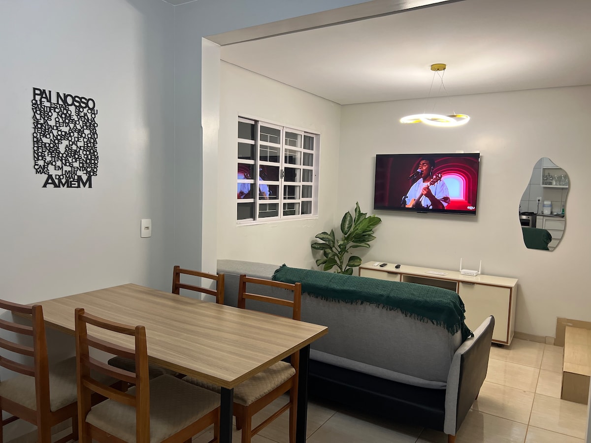 Casa aconchegante, c/ espaço privativo, em bairro calmo, fica 2 minutos do shopping, está próxima à supermercados, restaurantes, farmácias, postos de gasolina, hospitais e à saída da cidade pelo anel viário. A mesma possui sala c/ sofá cama, cozinha equipada (microondas, airfryer, pipoqueira, panela de pressão elétrica, bebedouro para água mineral e utensílios), 2 quartos sendo: 1 c/ ar condicionado, 1 cama de casal e 1 cama de solteiro; e outro c/ ventilador e cama casal. Toalhas e lençóis.