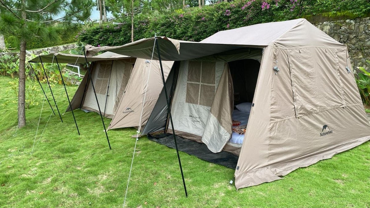 Experiência na natureza Vistas fantásticas para montanha/jardim/distrito, privacidade espaçosa para 1-22 pessoas. Apenas 1 reserva/noite (sem vizinhos!) 3 tendas de acampamento de luxo grandes + 1 pequena com iluminação solar. Mais 3 tendas extras (2 pequenas, 1 grande) para grupos maiores, taxas adicionais se aplicam. Uso exclusivo total de todas as instalações, incluindo um grande terraço 2 banheiros sociais, separados para tendas Café, chá, água mineral, café da manhã e marshmallows gratuitos para a fogueira (se o tempo permitir) Sem restaurante ou cozinha, mas almoço pré-reservado, churrasco, atividades disponíveis