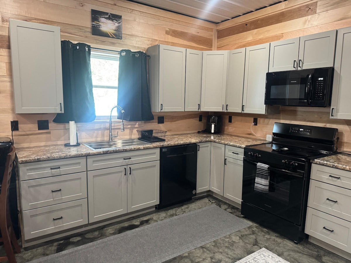 Recém remodelado . Casa de campo de edifício completo de um andar. Cama queen para 2 pessoas, grande sofá seccional e recanto para o pequeno-almoço. Localizado numa rua privada sem saída, máquina de lavar, secador, fogão, máquina de lavar louça, micro-ondas e frigorífico. Terraço anexo com conjunto de pátio. Basta perguntar se tem mais de 3 hóspedes e não se importa com uma casa mais pequena.