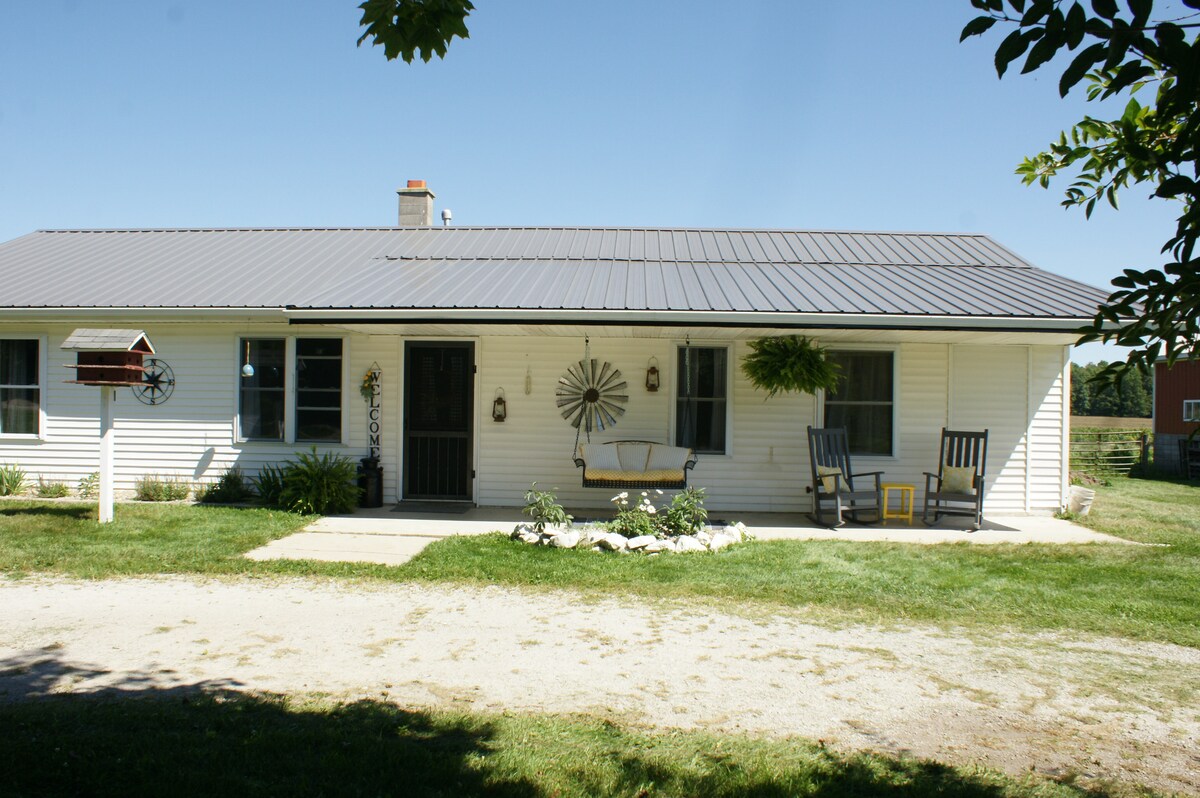 Hospede-se em uma suíte privativa no 2º andar em uma casa de fazenda moderna onde residimos em uma fazenda familiar no país Amish. Os hóspedes têm todo o 2º andar: 2 quartos, um banheiro privativo e uma sala de estar. Você pode assistir buggies Amish passarem enquanto você balança na varanda da frente, acessa espaços de pátio compartilhados ou se senta perto de um riacho. Temos vacas, cabras e galinhas. Estamos no coração da comunidade Amish/Menonita de Shipshewana, a poucos minutos do centro de Shipshewana e tudo o que ele tem. Um refúgio rural autêntico e confortável.