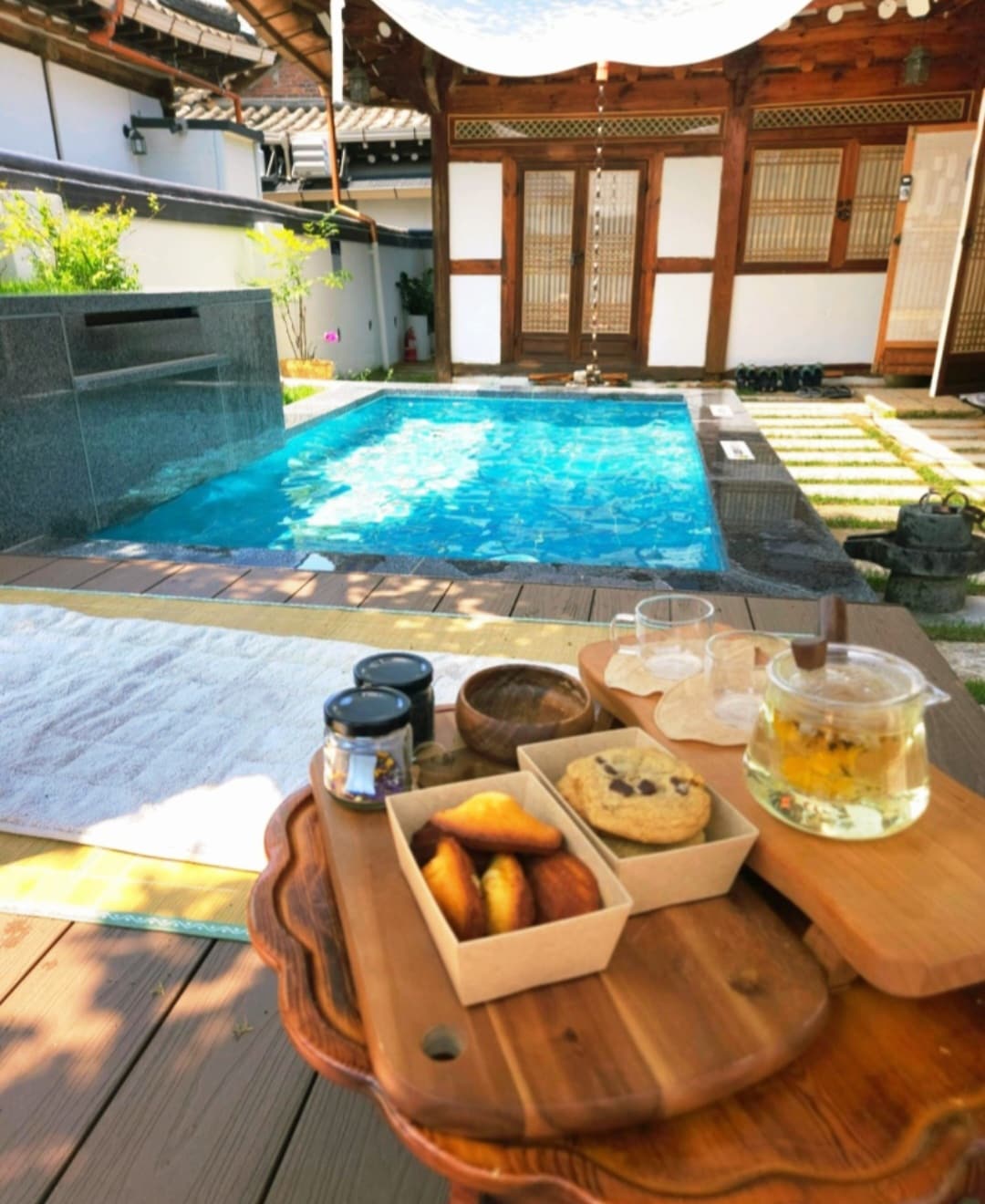 É composto por um único tipo de hanok, construído com tijolos ocidentais e argila amarela, e é possível estacionar um carro particular na frente da acomodação. Tem um quintal, jacuzzi, standby, alto-falante Geneva e Wi-Fi, e é um espaço onde você pode relaxar sem ser perturbado por familiares, amigos ou amantes.