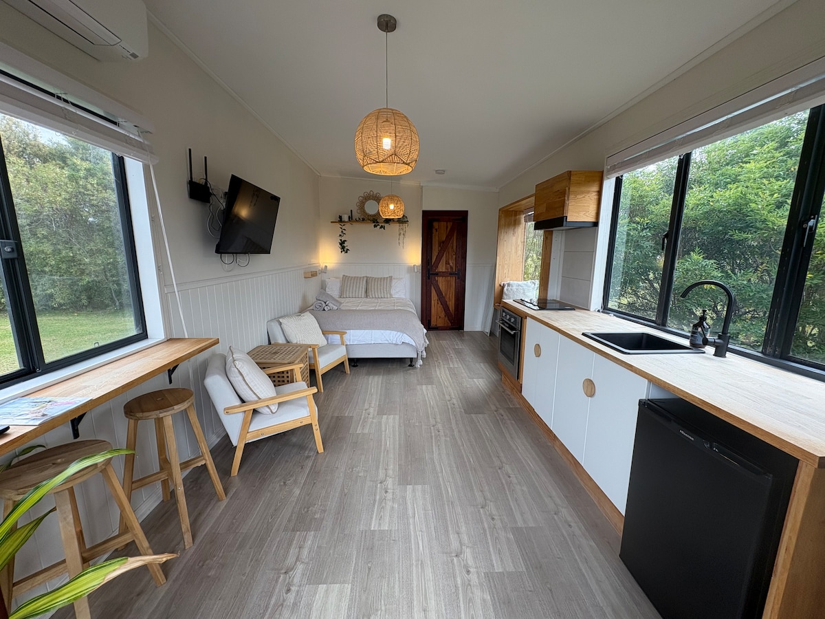 Relax your body and soul at this tranquil getaway. Our luxe tiny home has been designed and styled with your relaxation in mind. With every window looking out to garden and farmland views, you'll feel miles away from the rest of the world. We have a multitude of beaches between 10-15 minutes drive, and town is just 5 minutes away. The tiny home's fully appointed kitchen and bathroom have premium fittings and appliances, and we provide organic bath and shower supplies.