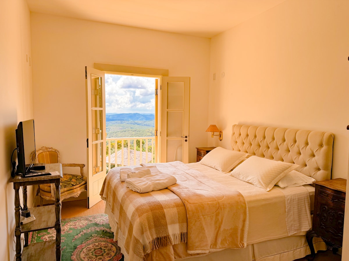 A Suíte é um refúgio acolhedor de 25 metros quadrados, ideal para quem busca conforto e tranquilidade durante a estadia. O ambiente é amplo e bem iluminado, com uma cama de casal aconchegante que convida ao descanso após um dia explorando a cidade. A decoração combina simplicidade e charme, criando uma atmosfera relaxante e agradável. A TV garante momentos de entretenimento, enquanto o terraço e a varanda privativa oferecem um espaço perfeito para apreciar a vista ao entardecer.