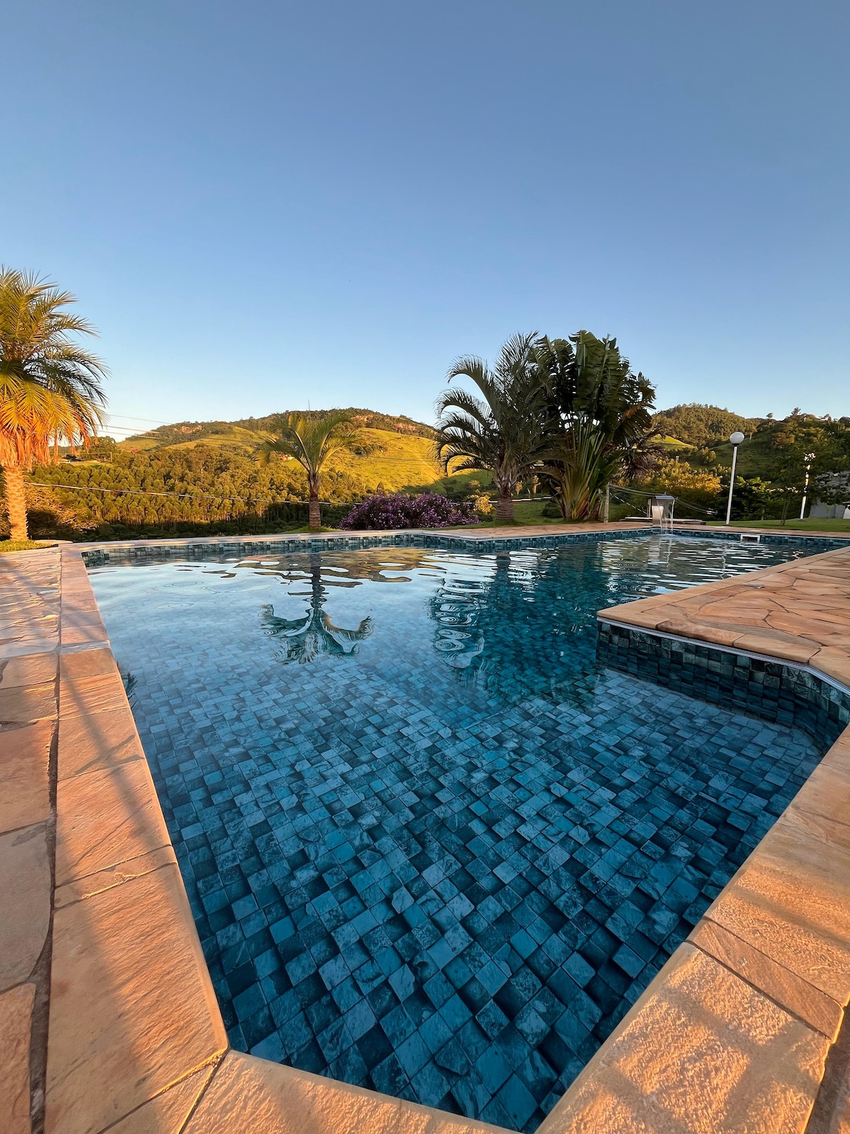 Sítio com vista, cachoeira, lareira e piscina.