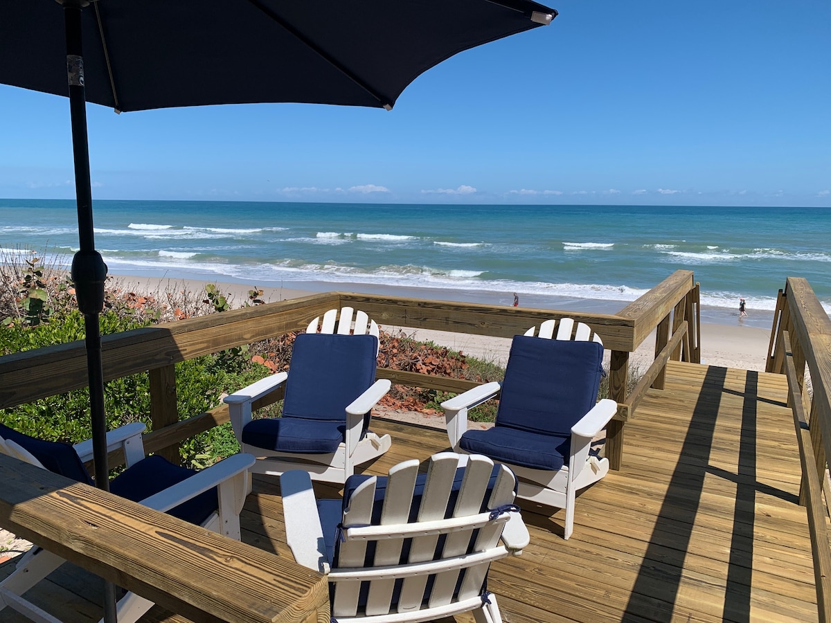 Localização, privacidade, oceano. Devido a preocupações com a saúde, a piscina vista de fotos aéreas não está disponível de novembro a maio porque os proprietários estarão na residência na casa principal. Bem-vindo ao Nova Beach Cottage, a casa de hóspedes na propriedade à beira-mar do famoso escultor, Mihai Popa, também conhecido como “Nova”. Localizado na ponta sul da Ilha Hutchinson Norte, diretamente ao lado do Parque Estadual de Fort Pierce Inlet. Jardim e caminho para a praia a poucos passos do chalé. Pátio coberto do quarto.