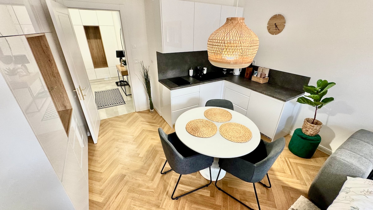 Tome café da manhã em uma mesa com design inteligente em uma cozinha luminosa com pisos de madeira nodosos e floreios minimalistas. O espaço com 95 metros quadrados, janelas altas inundam uma área de estar vibrante em luz natural, onde um sofá moderno oferece o local perfeito para se aconchegar com um bom livro. Além disso, à noite você pode desfrutar de cada pedacinho do seu sono, pois o lugar é muito tranquilo, apesar de sua localização muito central. Espero que você ame minha casa como eu e torne sua estadia uma experiência agradável.